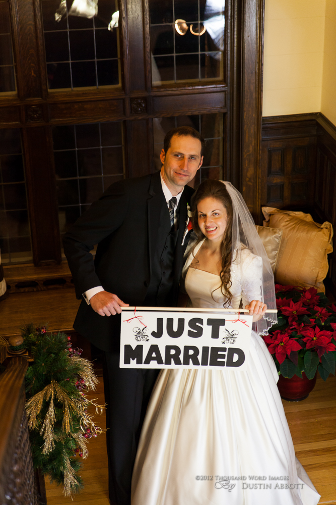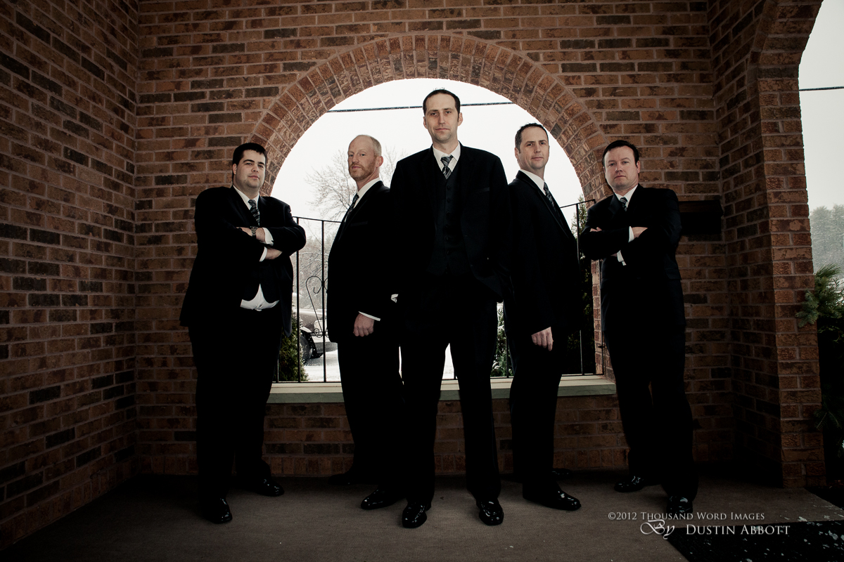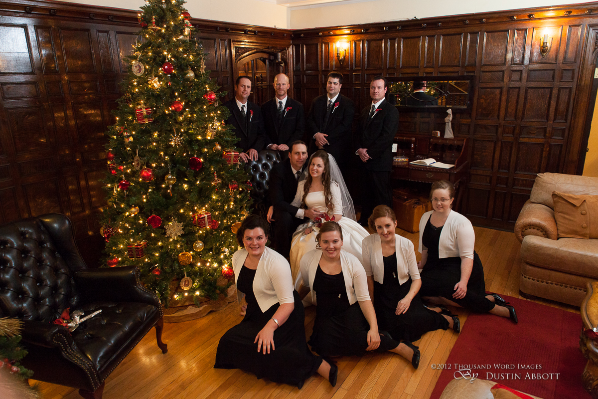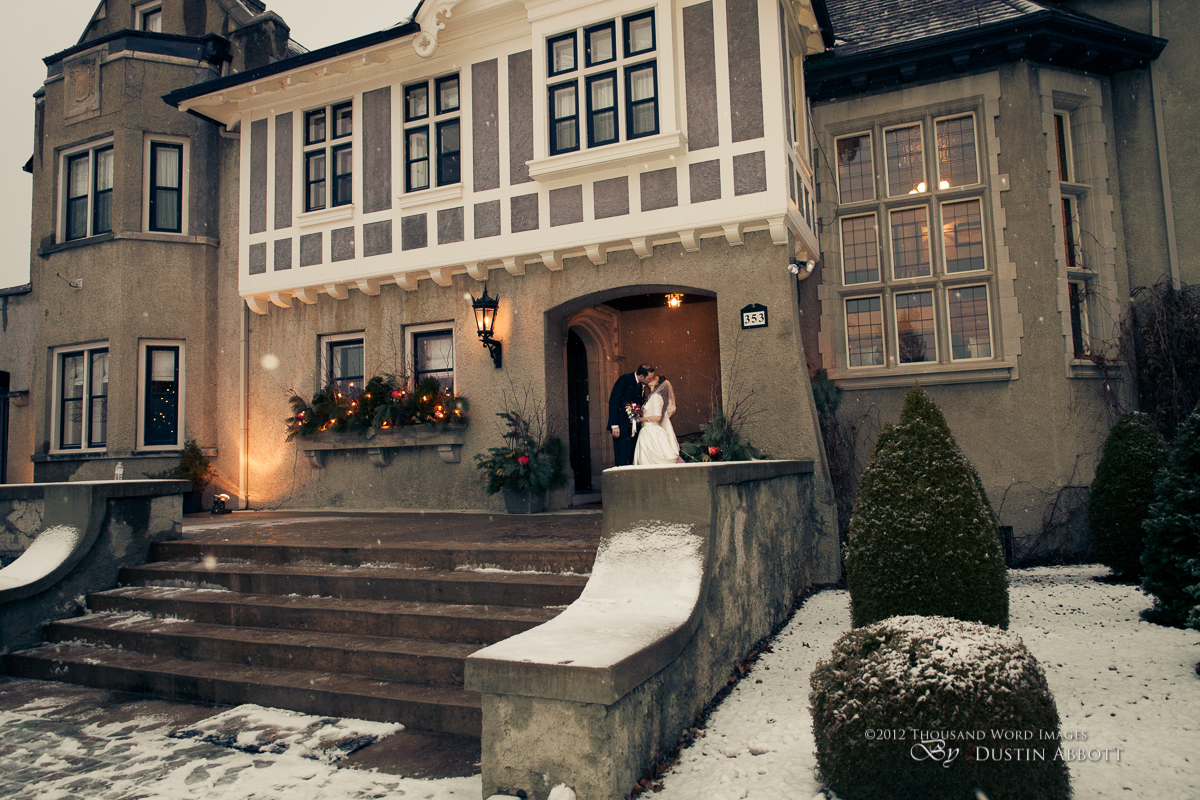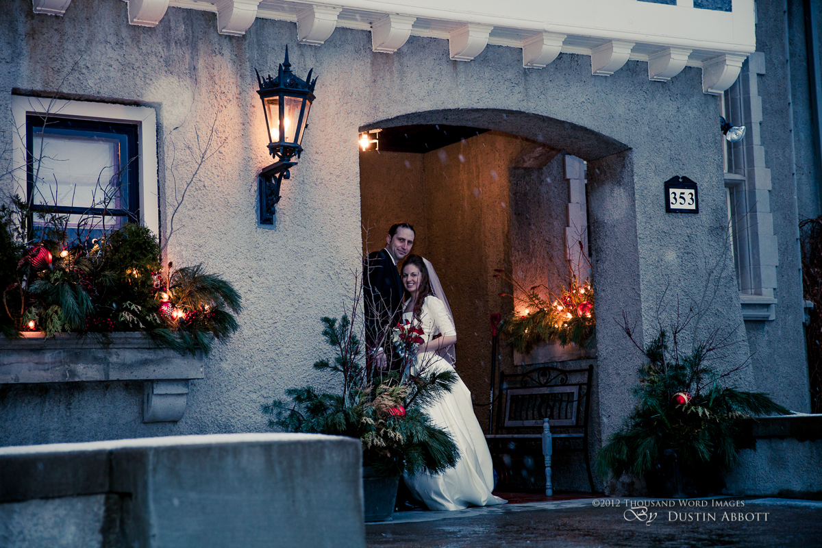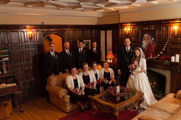 Finally, a few remarks about the day to establish context. This was a winter wedding. It was grey, and alternated between snow and frozen drizzle. At no point was the light exceptional. Secondly, by the time we got to our primary shooting destination after the ceremony, there was less than an hour of natural light before complete dark conditions. The interior where we shot had nice ambient lighting for mood, but it was very low for capture. I shot first with two speedlites (a Canon 580exII and a Canon 430exII) with wireless triggers shot through translucent umbrellas. For my wide shots of the wedding party I was still shooting at ISO 2000. I shot nothing at truly low ISOs throughout the day. My lowest ISO with any posed pictures was ISO 1000 with the bride and groom when I moved to fixed lighting of two 400watt equivalent daylight CFLs shot into gold and silver reflective umbrellas. So even with the 5D’s great ability to handle noise, I still wasn’t at the optimum end of noise conditions.