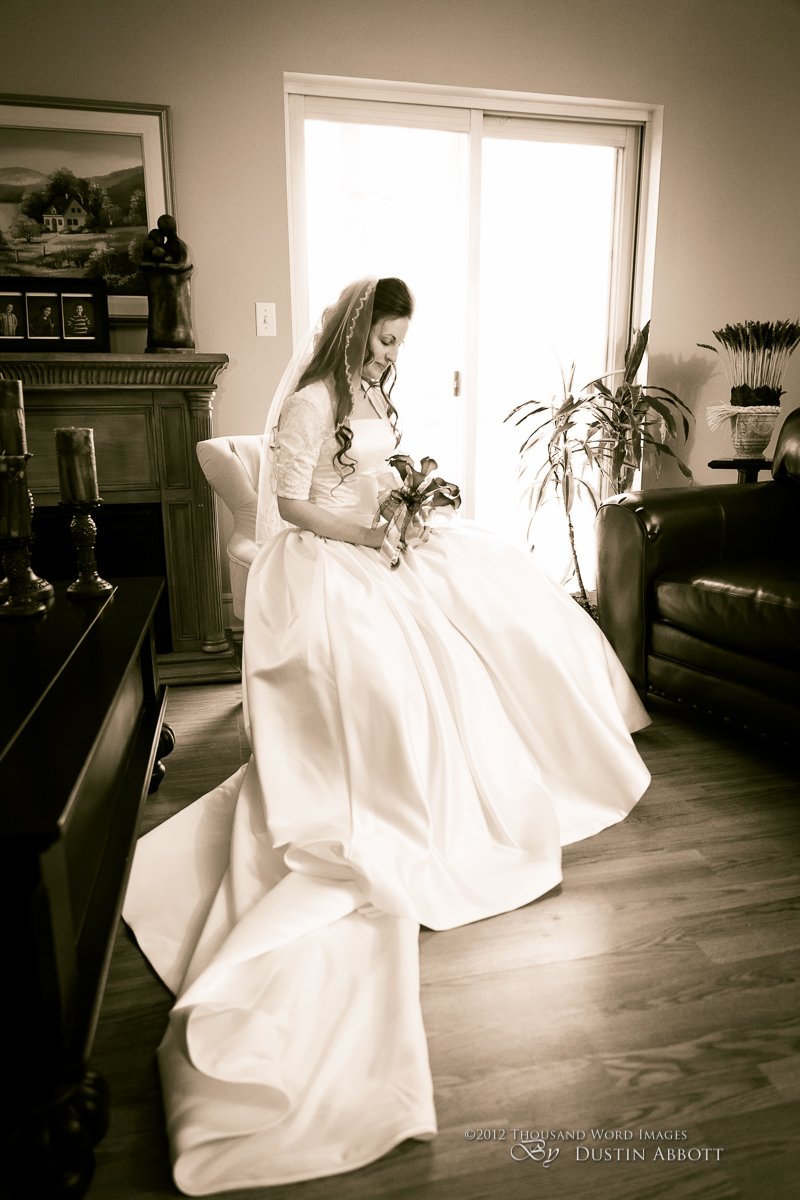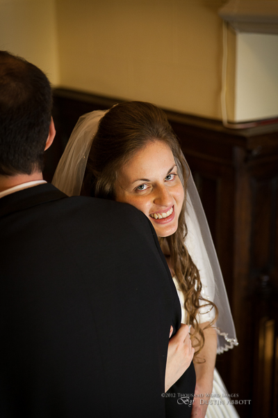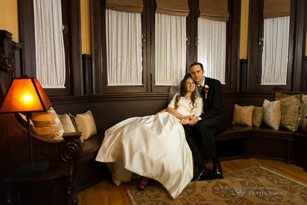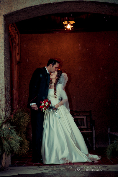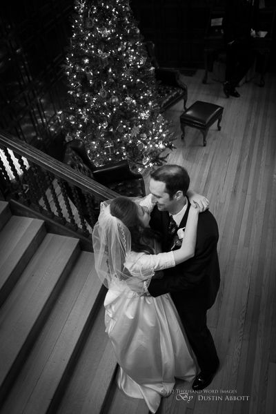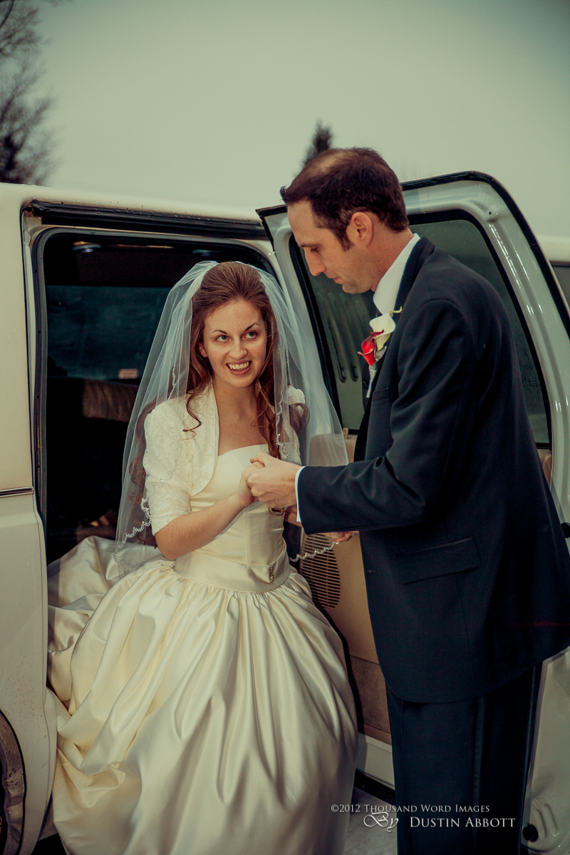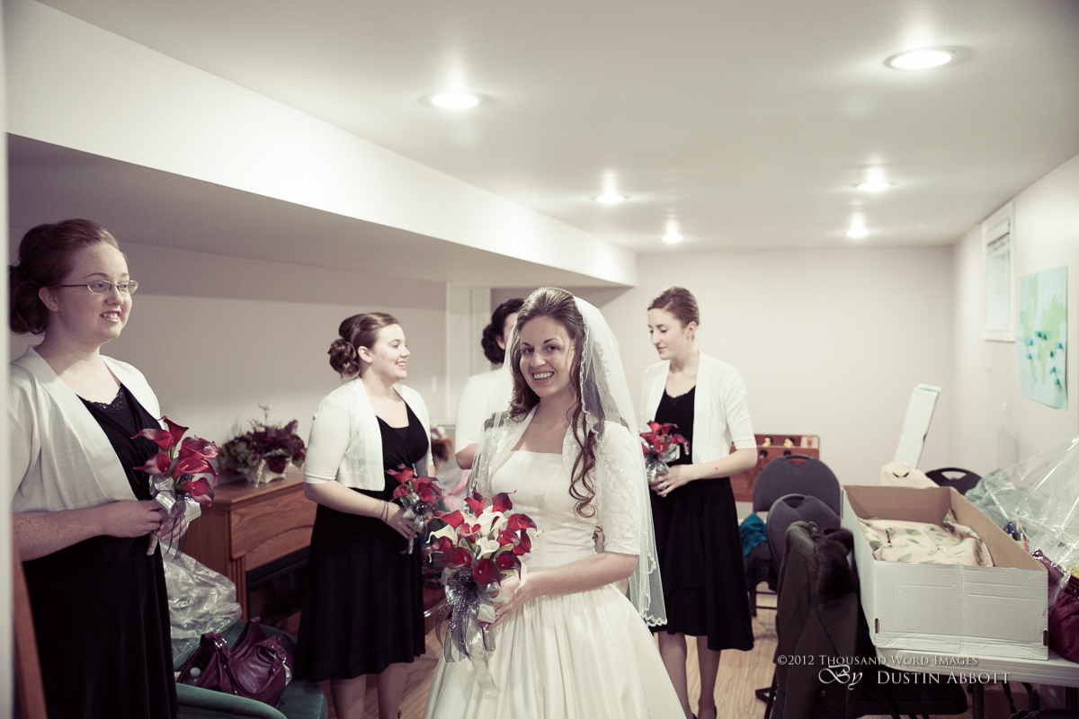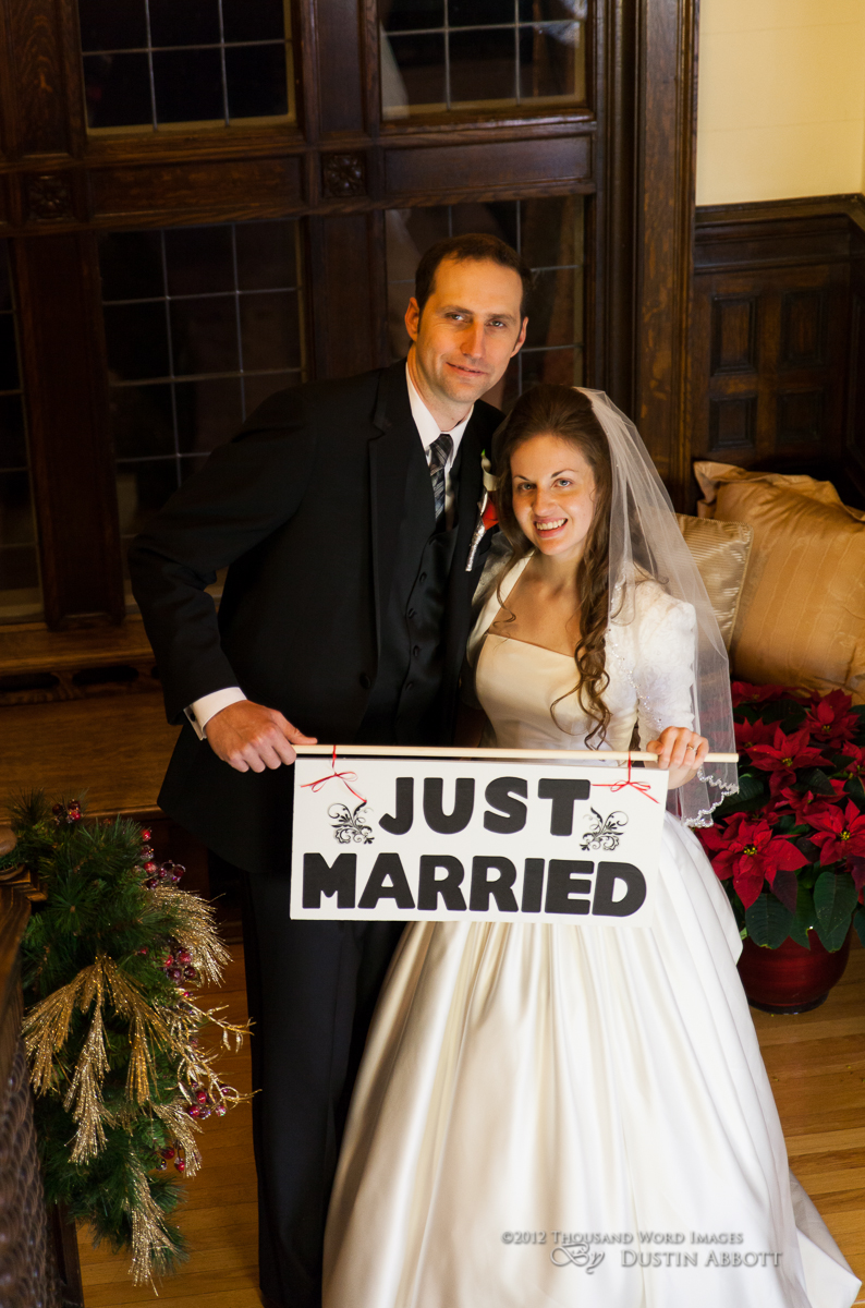 Finally, a few remarks about the day to establish context. This was a winter wedding. It was grey, and alternated between snow and frozen drizzle. At no point was the light exceptional. Secondly, by the time we got to our primary shooting destination after the ceremony, there was less than an hour of natural light before complete dark conditions. The interior where we shot had nice ambient lighting for mood, but it was very low for capture. I shot first with two speedlites (a Canon 580exII and a Canon 430exII) with wireless triggers shot through translucent umbrellas. For my wide shots of the wedding party I was still shooting at ISO 2000. I shot nothing at truly low ISOs throughout the day. My lowest ISO with any posed pictures was ISO 1000 with the bride and groom when I moved to fixed lighting of two 400watt equivalent daylight CFLs shot into gold and silver reflective umbrellas. So even with the 5D’s great ability to handle noise, I still wasn’t at the optimum end of noise conditions.