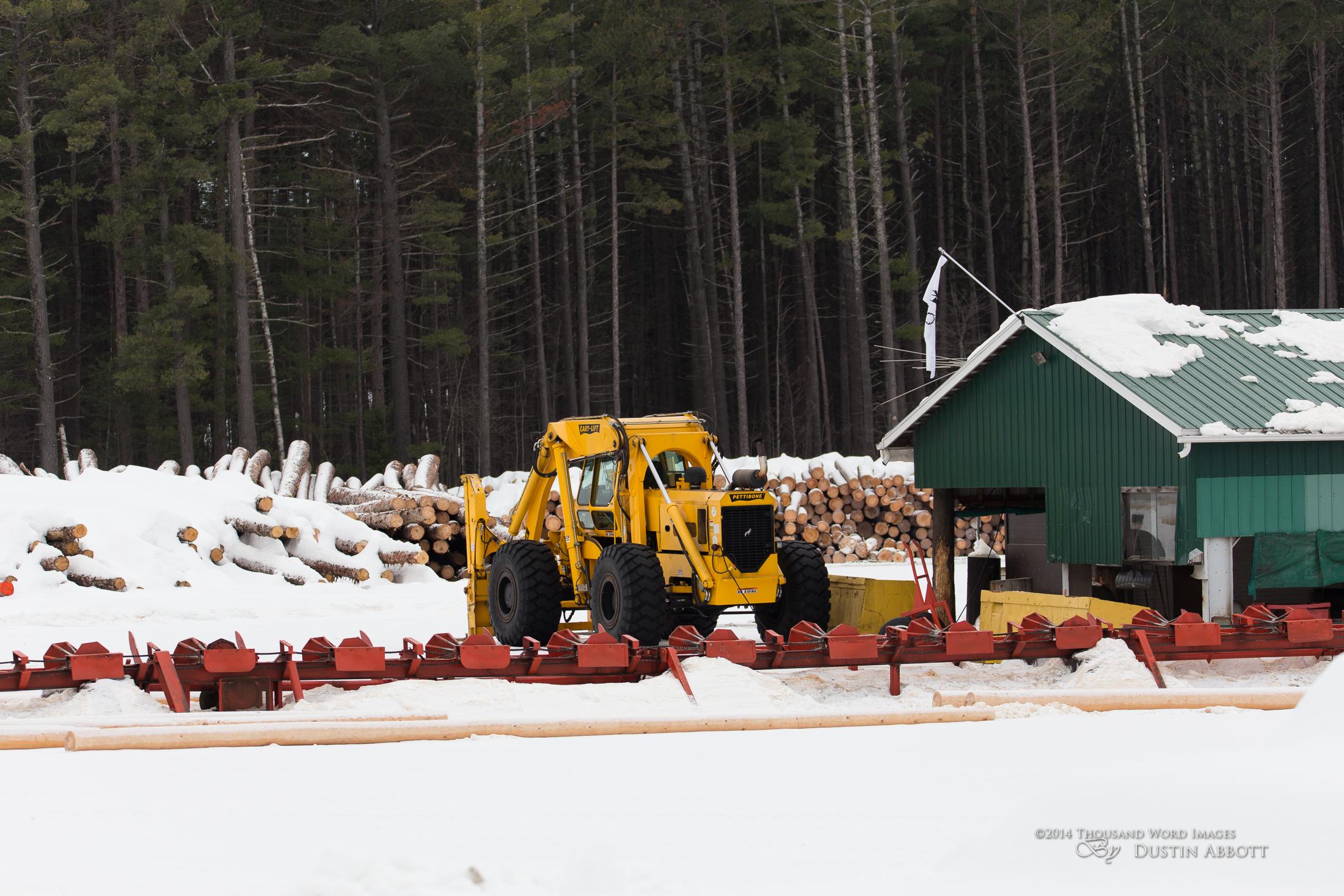 Let’s also have a look at the other end of the spectrum. This image is handheld, 150mm, f/5 (wide open), 1/400th second shutter speed. There isn’t much in the foreground because of the snow, but we will take crops from 1) Extreme upper left corner 2) Middle extreme top 3) Center of the image (focal point on the front end loader) and 4) Extreme upper right corner. I would love to take crops from the lower corners for you, but there wouldn’t be much there to see.