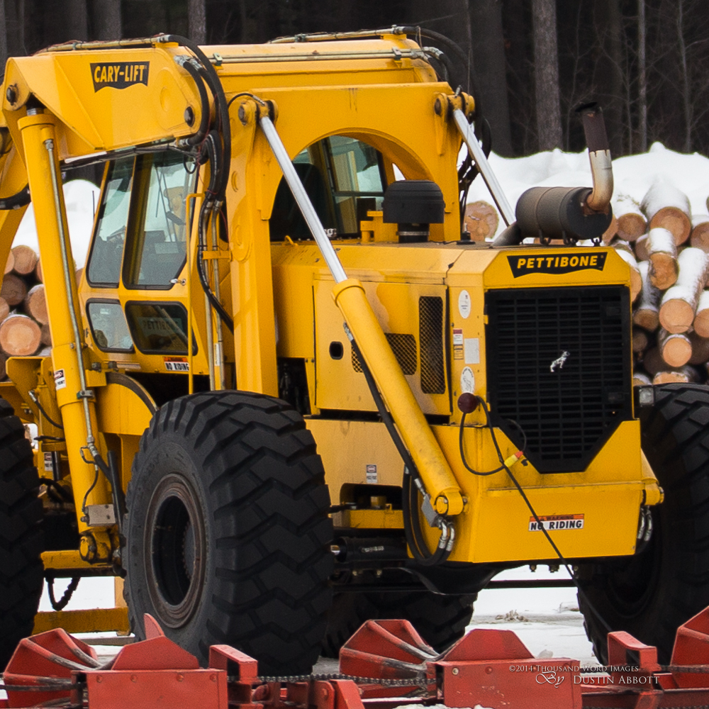 Let’s also have a look at the other end of the spectrum. This image is handheld, 150mm, f/5 (wide open), 1/400th second shutter speed. There isn’t much in the foreground because of the snow, but we will take crops from 1) Extreme upper left corner 2) Middle extreme top 3) Center of the image (focal point on the front end loader) and 4) Extreme upper right corner. I would love to take crops from the lower corners for you, but there wouldn’t be much there to see.