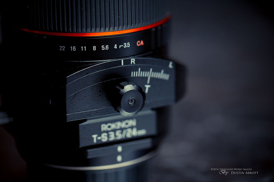 Unlike other lenses, a tilt-shift lens also has the mechanism for tilting the lens and shifting the lens. On the Rokinon this equals a slightly larger black knob for tilting (8.5 degrees left and right), a smaller black knob for shifting (+/- 12 degrees), and then a corresponding grey knob for each on the opposite side that is a locking mechanism. It is important to remember to loosen the locking knobs before shifting. Roger at LensRentals reports that tilt-shift lenses frequently return damaged because someone forced movement while the locking knobs were tightened. The locking knobs feel slightly flimsy to me, but again, that is a “feel” perception. The final controls on the lens are a couple of levers that allow rotation of each of these mechanisms. This is the only real mechanical difference between the Rokinon and the Canon. It allows a full 360 degrees of rotation, while the Rokinon allows for only 180 degrees of rotation.