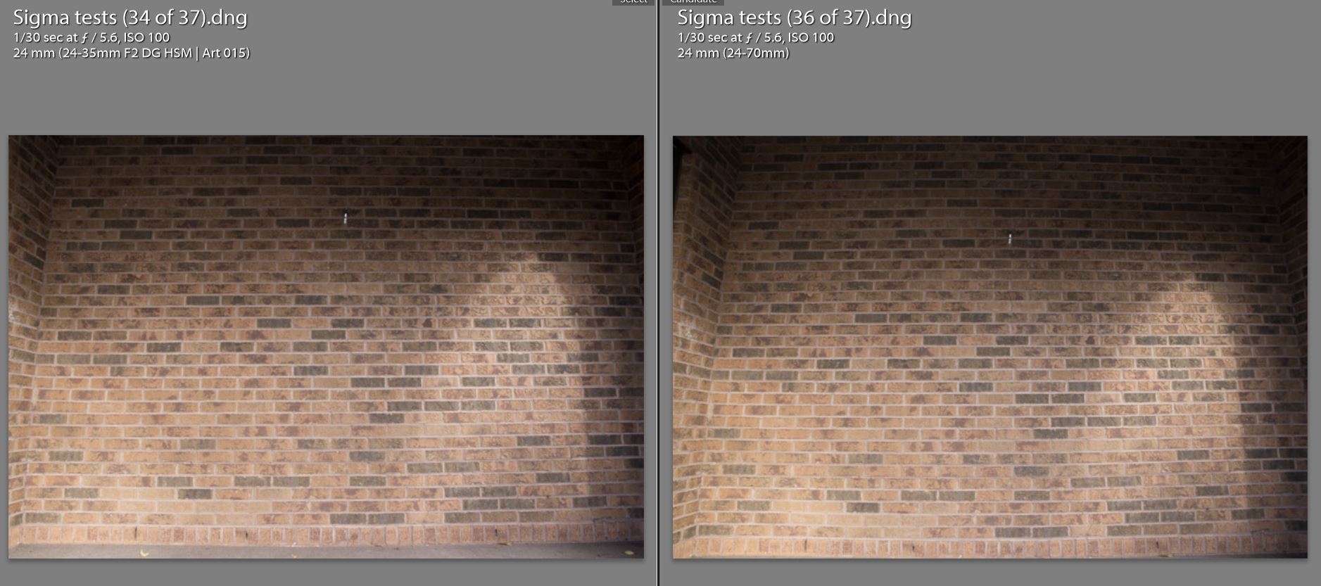 - Distortion control is very impressive. 24mm is fairly wide, but even at 24mm the amount of distortion is nicely managed. I decided to do a comparison between the Tamron 24-70 VC at 24mm. I wanted to see directly how much distortion there was by comparison, and using a brick wall also reveals distortion patterns. The Sigma showed very low barrel distortion. There was a clear difference between it and the Tamron (which actually has less barrel distortion than Canon’s own 24-70mm f/2.8L II). Across the frame the Sigma is producing nicely straight lines. Little correction is needed. The first image below shows the comparison between the Tamron (right) and Sigma (left). The last two shots show the results from the Sigma at 24mm and 35mm respectively.