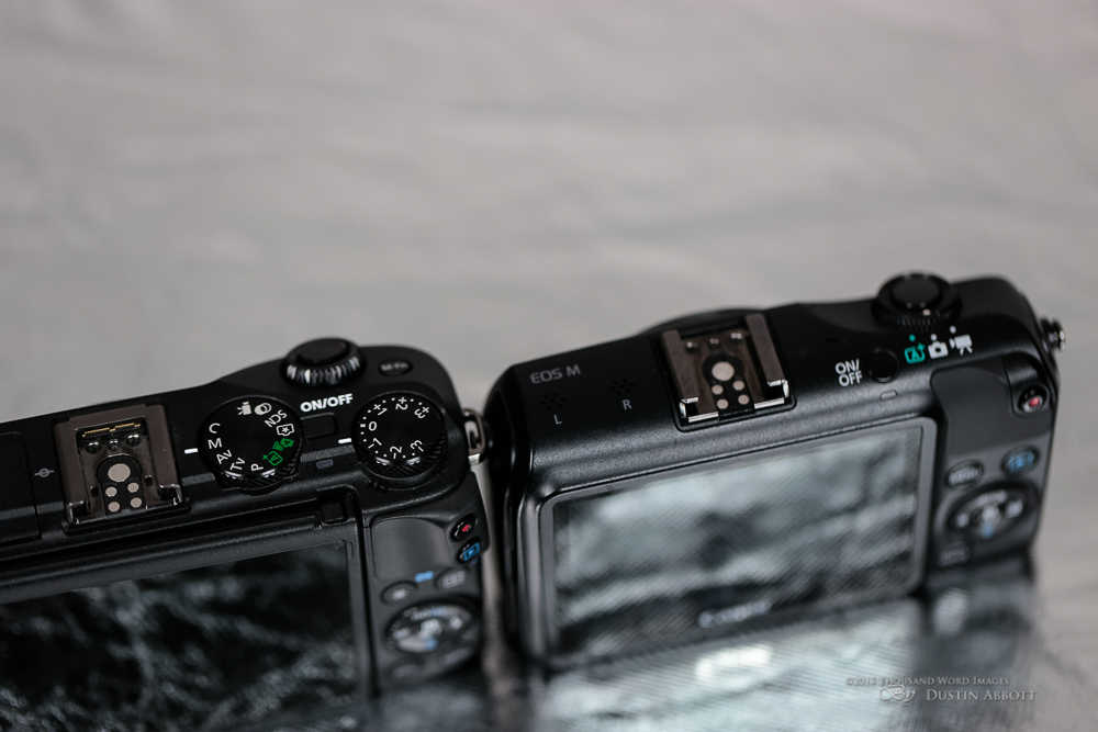 The M also lacked any kind of dial around the shutter release button (at least in a traditional sense). There was a bit of dial, but that was to choose between the three camera modes (Auto, M/AV/TV, or Video). As a result it was not unusual to inadvertently switch to the wrong mode. The M3 not only puts the shutter release button in a better/more natural position, but also gives you a fully functional dial that allows to change shutter speed in Manual mode or Aperture in AV mode. It also adds a fully functional dial for different camera modes (most of which had to be previously accessed through the menus) and also a second dial (THANK YOU!) for dialing in exposure value changes in up to 3 stops in either direction (+/-). It is fantastic to be able to quickly use that dial on the run to influence exposure in the way that you want.
