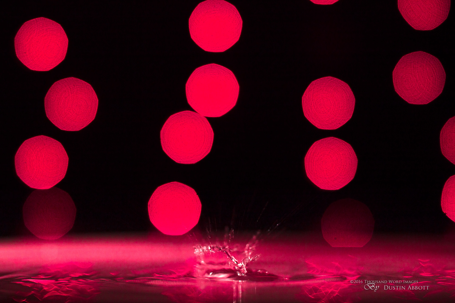 In post I added a little more light to the foreground, removed a few specks out of the bokeh (from splashes), and then pulled the saturation strongly towards the reds to emphasize the Valentine timing of the image. Hence my title – “One Drop of Your Love”.