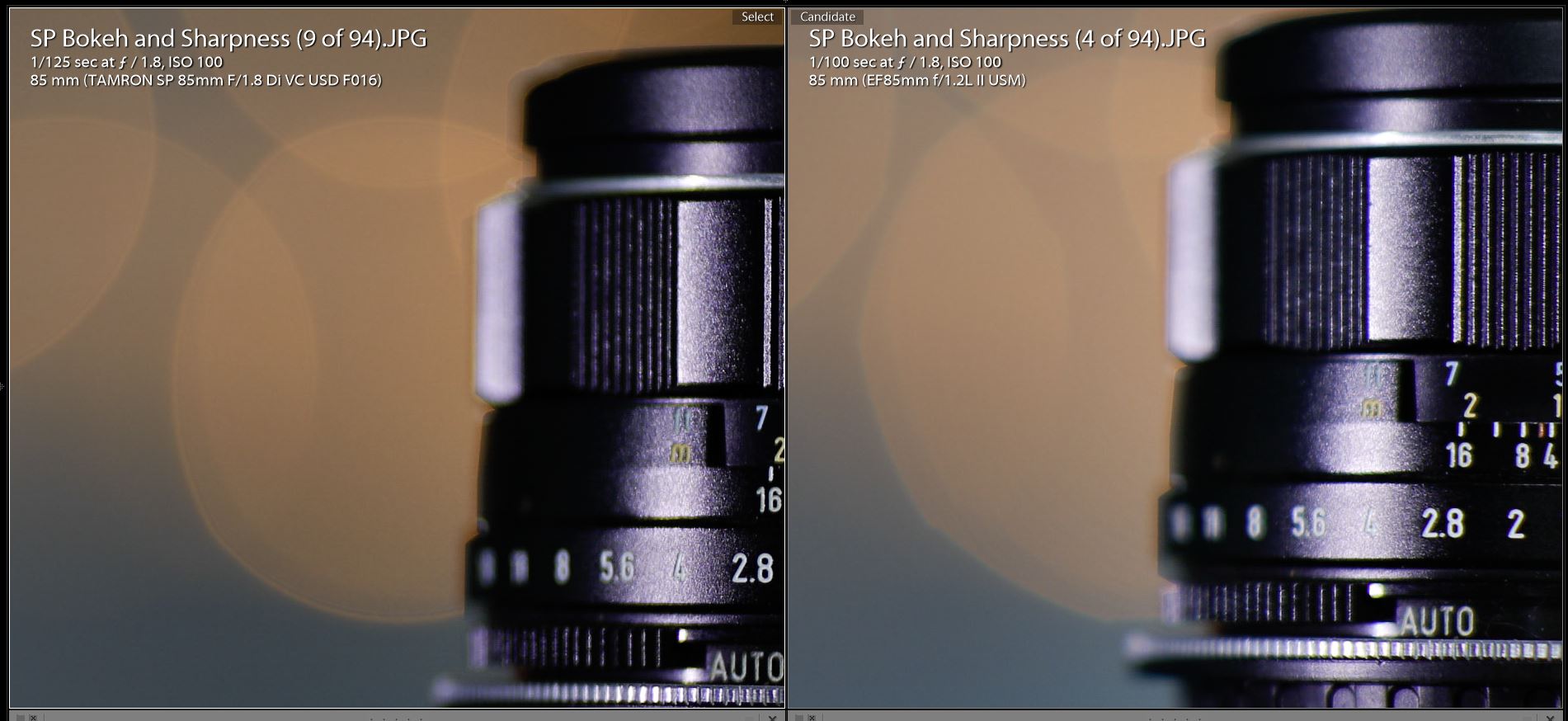 The bokeh circles are HUGE, with almost no inner lines at all at f/1.2. There is almost no activity in the circles at all in the middle, with only a slight bit of activity in the circles near the edge. The Sigma was good, too, but there was certainly more busyness in the inner circle and a more defined inner line. It is interesting to note that even with equal framing and aperture values the bokeh “circles” remain slightly larger from the XP 85. Even with all things being equal it produces more bokeh than the competitors!