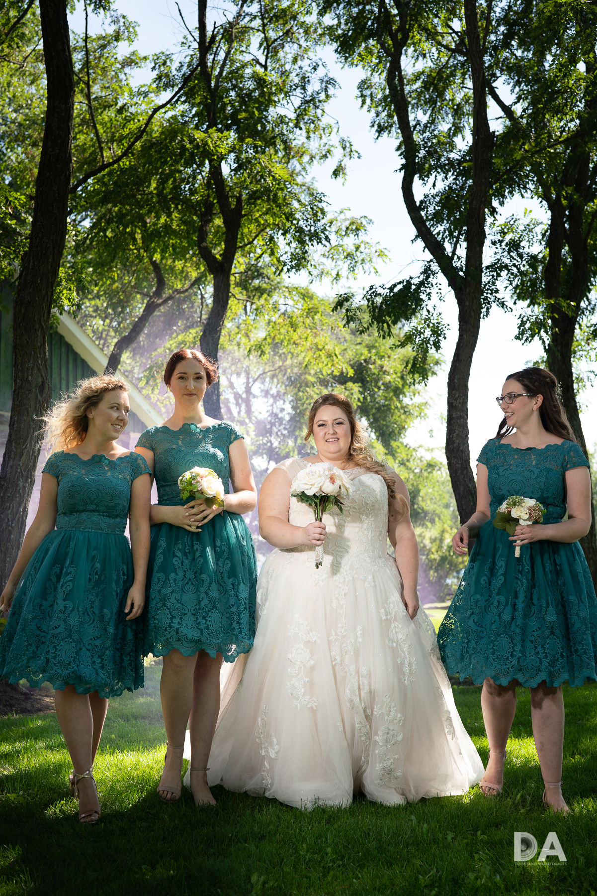 This photo was actually quite dark to begin with due to the fact that I had been shooting with the Canon body and quickly switched over to the Sony for different framing. Obviously you have a fairly narrow window of shooting opportunity before the smoke bomb dies off, so I wasn’t taking time to review the back of the screen (by the way, if you are interested in experimenting with smoke bomb photography, here’s a great article that will teach you the basics.) I have solved the issue with my Metz 64 AF-1 flash units being designed for Canon E-TTL by just having a Yongnuo YN-622C-TX wireless command unit on the hotshoe of each camera, and then I put my flash units on separate channels with Yongnuo YN-622C wireless triggers mounted to the flashes. I just put the flash command unit in Manual HSS (High Speed Sync) mode and control the power output from the TX command units. This system seems to work well, and allows me to make quick adjustments on the fly and not worry about shutter speed due to being in HSS mode. Because the flash units are wirelessly controlled, I just use a few assistants (or even a few helpful volunteers from the wedding party) to hold my lights at the height/angles that I want. I help shape and soften the lights by using the Lite Genius Super-Scoops on them (you can see my video review of these light modifiers here:). I had last used the Sony in a different setting, however, and I didn’t realize I needed to turn up power to the flashes for these shots…until I reviewed them after the smoke bomb had died off. The great news was the dynamic range of the Sony a7R3 made it easy to recover the image and turn it into a beautifully dynamic shot that was one of my personal favorites from the day. I had a similar recover on the shot below, as my assistant holding the flash on the left side of the group had gotten distracted and wasn’t pointing their flash unit in the right direction, leaving the bridesmaid on the left side of the image severely underexposed. No problem. A little selective exposure addition and shadow recovery in post, and the end result is very cool.