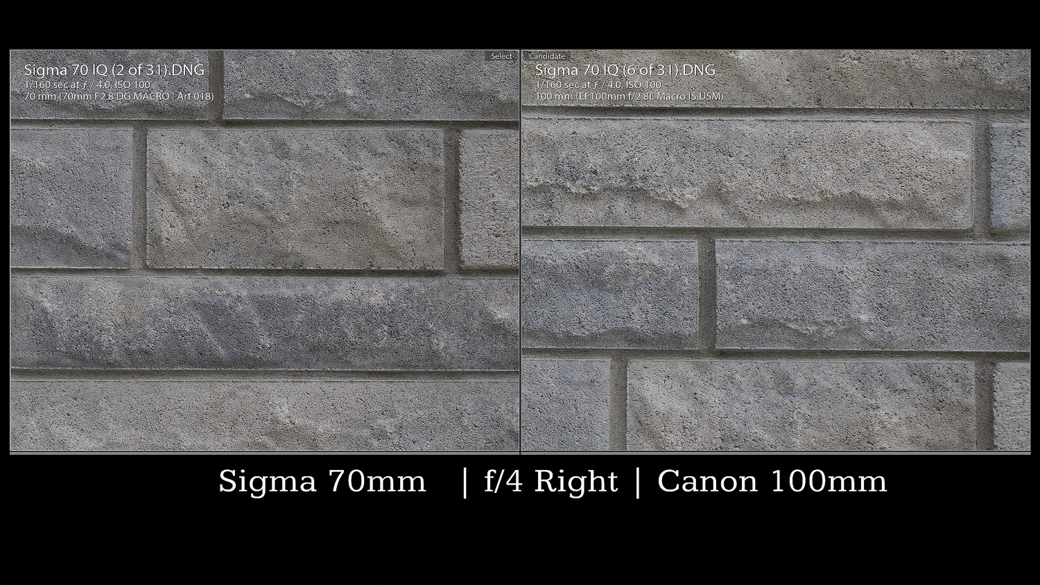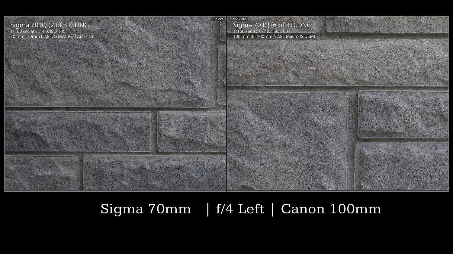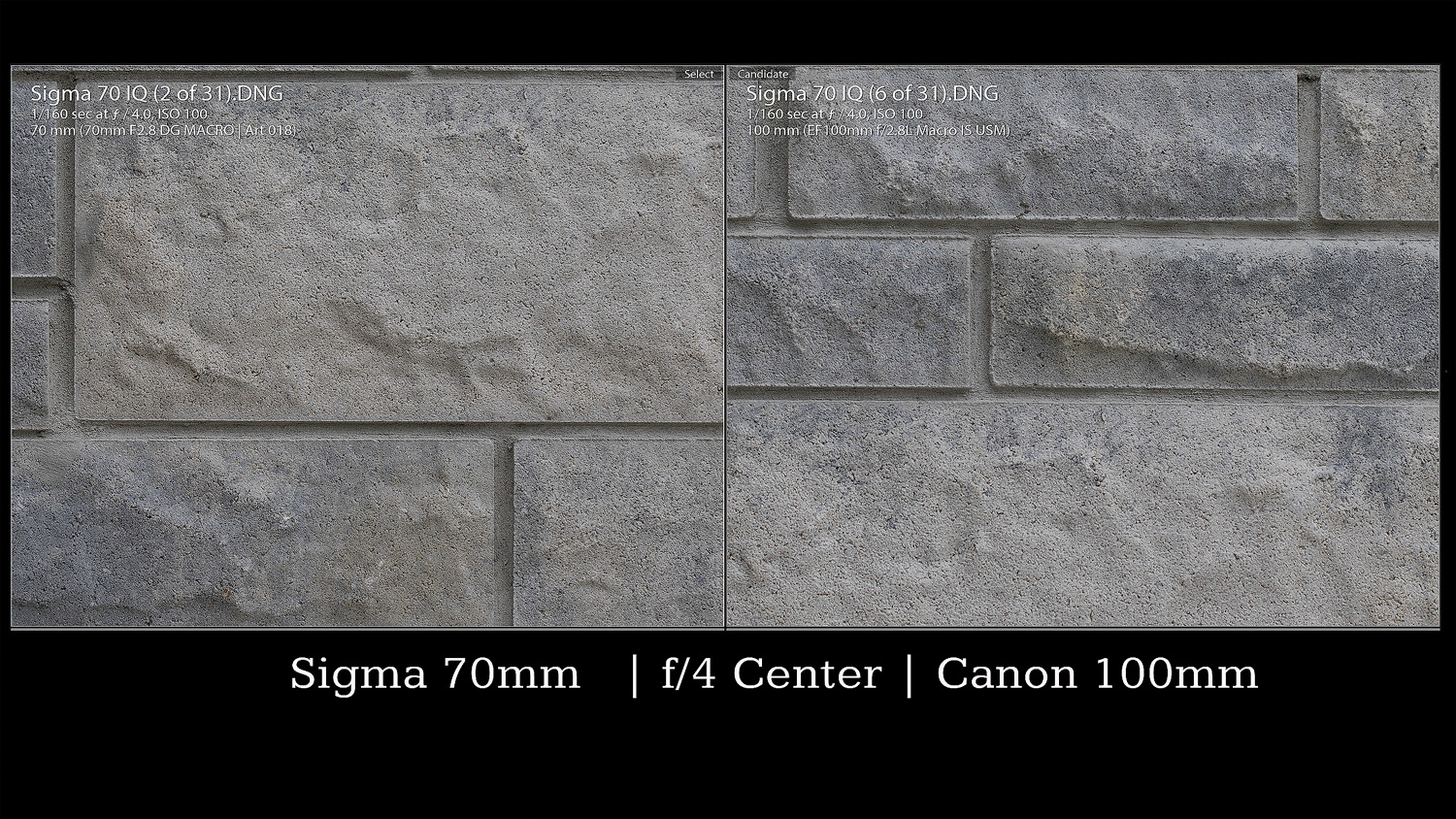The Sigma makes a more significant jump than the Canon at f/4, and the edge performance is just brilliant. The Sigma shows slightly more resolution along with higher microcontrast levels. Note how there is no haze in the stone textures anywhere. This is basically a perfect optical performance.