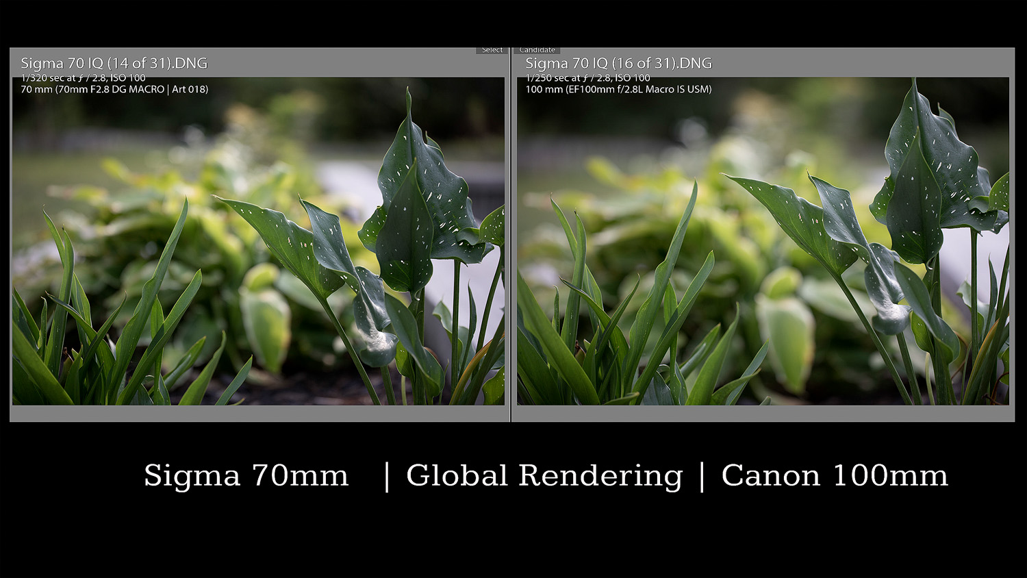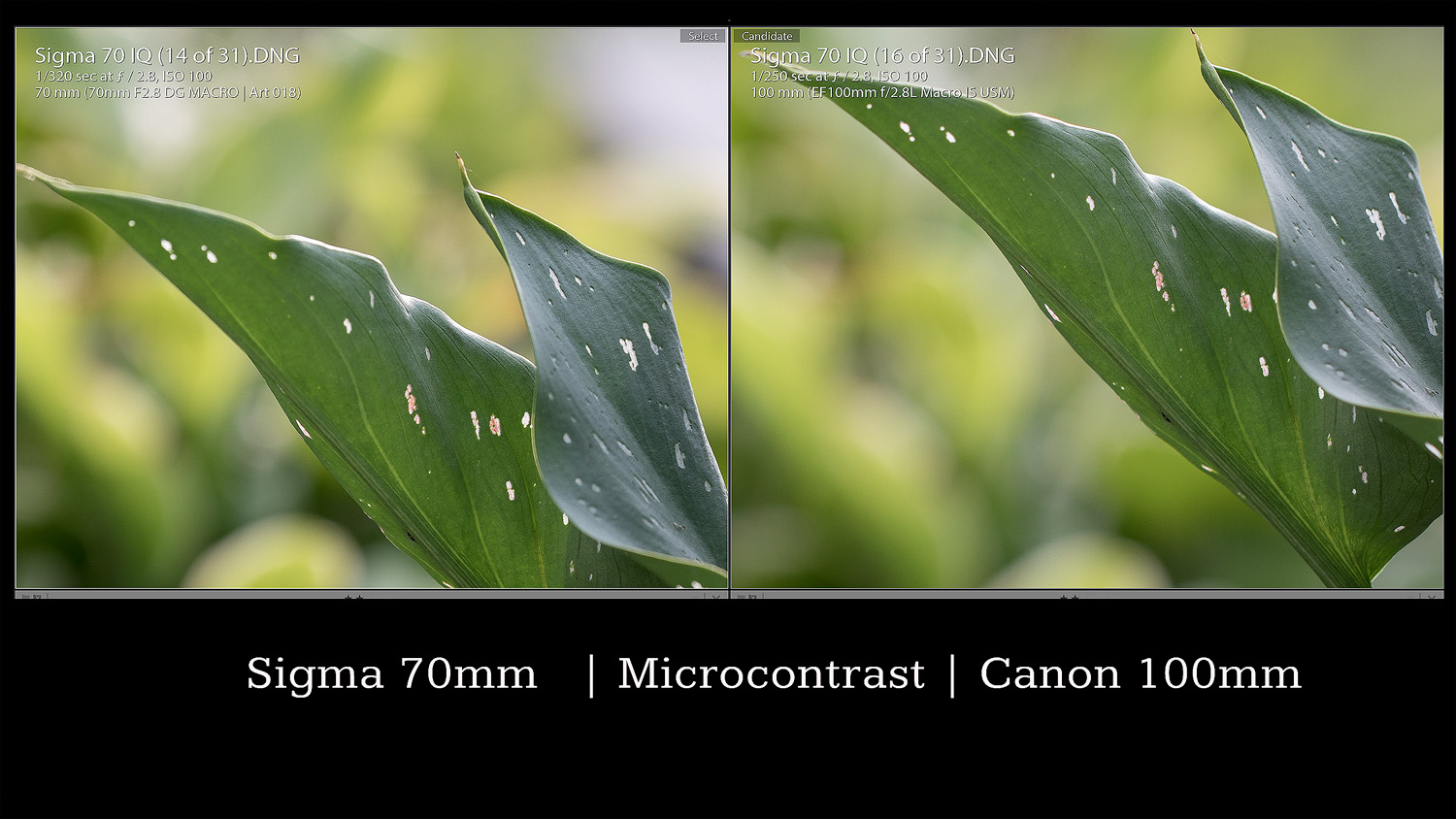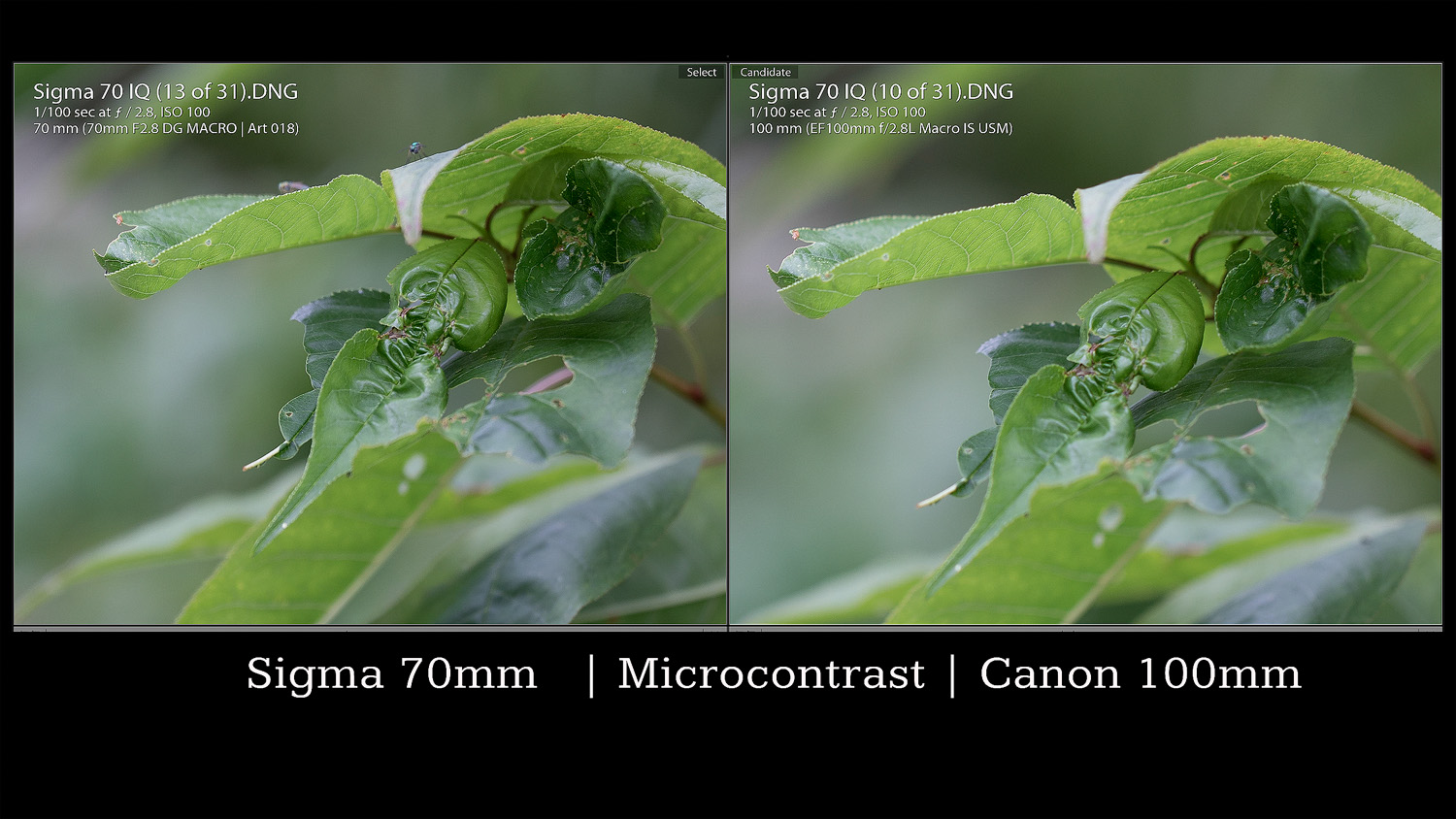 With both lenses wide open (f/2.8), I discovered the following. Both lenses metered identically and seemed to deliver similar light transmission. Both lenses exhibit some vignette to roughly equal degrees, and neither lens shows any visible distortion (very important in a macro lens!) The vignette will be cleared up either in post (by applying a lens profile), or can be corrected for in-camera for JPEGs with either lens. Both lenses show roughly equal amounts of center sharpness and contrast, but the Sigma is a little better along the edges of the frame (though both lenses are excellent across the frame). This is a very strong performance, as the Canon is an exceptionally good lens. The Sigma delivers just a slightly warmer color temperature than the Canon (a typical Sigma trait).