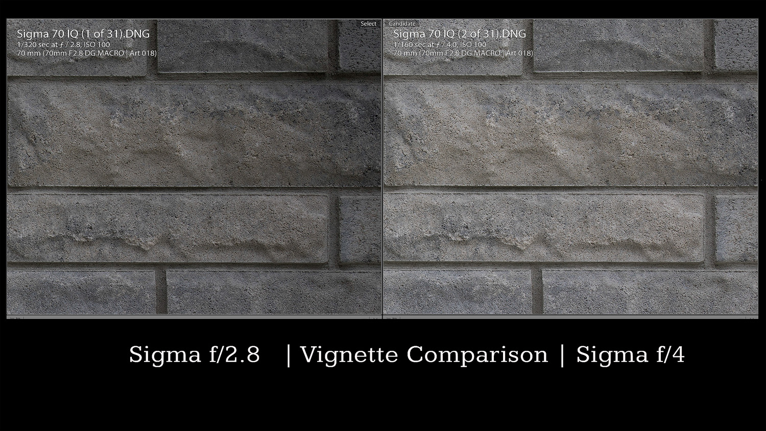 At f/4, the vignette mostly clears away on both lenses and they show a fairly even illumination across the frame. You can see from this comparison just how much the vignette lifts (this is from the right upper corner).