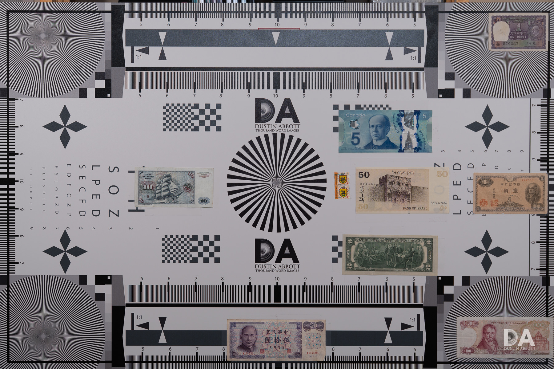 What we can see from the center is that even wide open at F2.5 the sharpness and contrast are impressively good. You can read the fine text on the bill even when shooting about 3 meters away. At the mid-frame, I do see a mild regression, as the upper left corner of the bill is sharper than the lower right corner. We also see some reduced contrast in the corner crop.