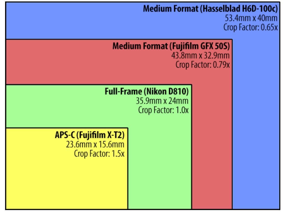 Nothing about the medium format platform is small or convenient in the traditional sense. The camera body is huge (Fuji does have smaller MF bodies, including the hotly anticipated GFX-100S), and the lens are large and bulky. Everything is expensive in medium format, with Hasselblad 100 MP bodies costing tens of thousands of dollars. In many ways Fuji has made medium format much more accessible, with more affordable (relatively!) cameras and lenses along with improved autofocus. Their mirrorless medium format cameras in some ways are not dissimilar to APS-C bodies like the X-T3 or X-T4, and are marketed as an upgrade over full frame to higher optical limits. Purists will point out that Fujifilm’s GFX sensor is not actually true medium format. It’s true that the sensor size (43.8 x 32mm) is about halfway between a full frame sensor (35.9 x 24mm) and Hasselblad’s 53 x 40mm sensor size. You can see a comparison of sensor size below: