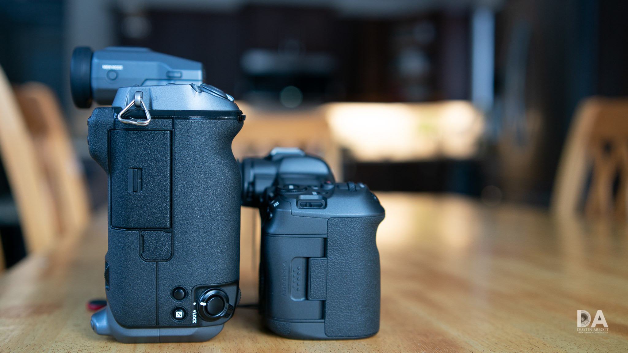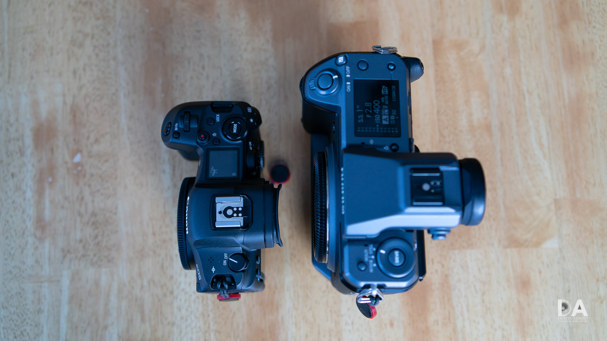 The GFX-100 is the giant in the GFX lineup, utilizing a “battery grip” type design with redundant controls for both portrait and landscape orientations. This is not a camera designed for either those with weak backs or those with small hands. It has the chunkiest grip of any camera I’ve used (the camera is 102.9mm/4.05″ deep), and while I have medium large hands, I can feel a slight stretch in my grip. The Canon EOS R5 has a rather robust grip on it, but the grip depth is only 88mm by comparison, and the battery-grip style Canon 1DX Mark III is only 83mm deep, which tells you how chunky that nearly 103mm grip is on the GFX-100. Those with smaller hands are most likely going to find using the GFX-100 an uncomfortable experience even if they have previously preferred the larger vertical grip styled cameras. I don’t find it uncomfortable myself, but it definitely feels large in the hand. You can see how the body and grip depth dwarf the Canon EOS R5.