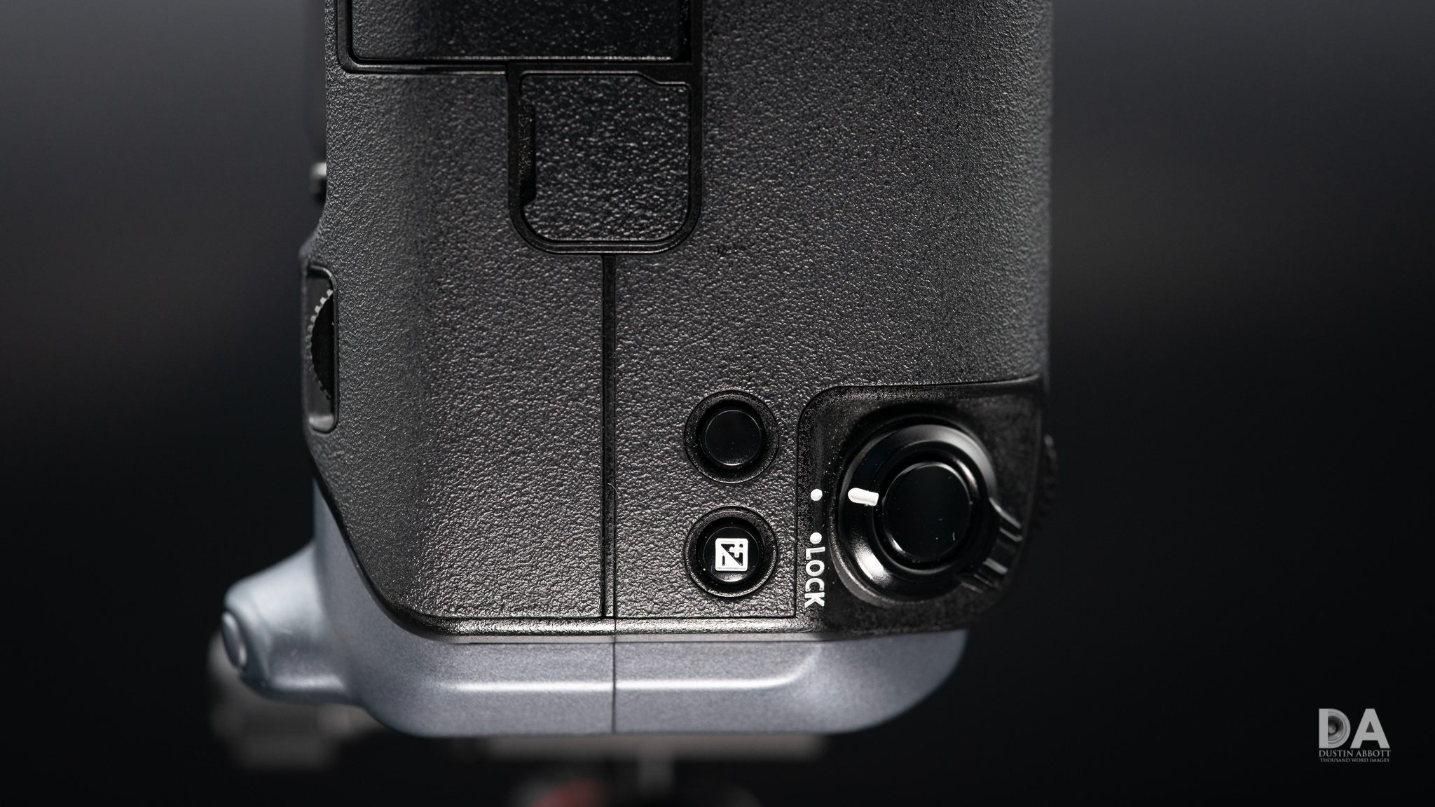 The front of the camera is fairly simple with only two buttons (one for horizontal, one for vertical grip) that by default control different performance modes, though like most of the buttons they can programmed to other functions.