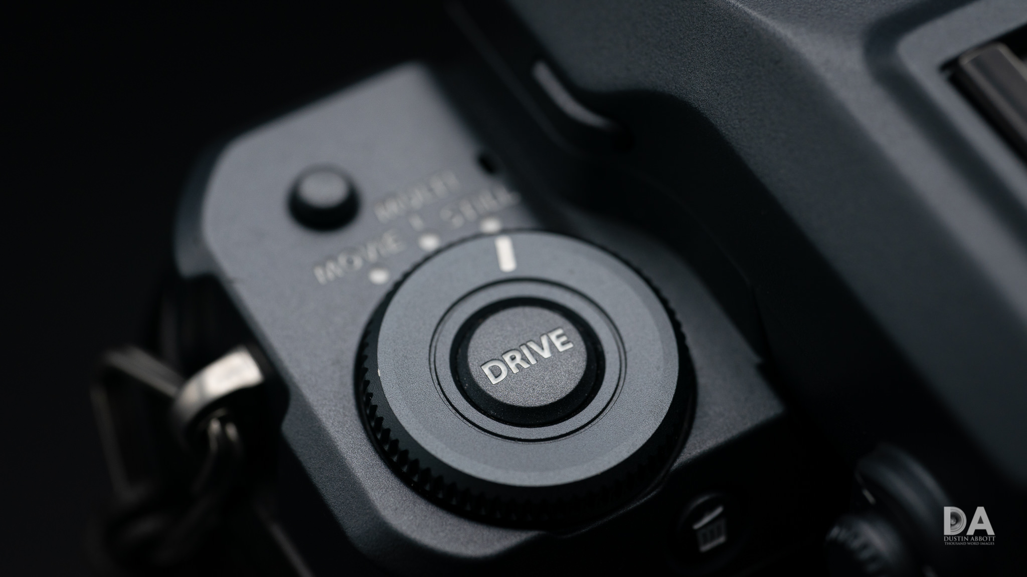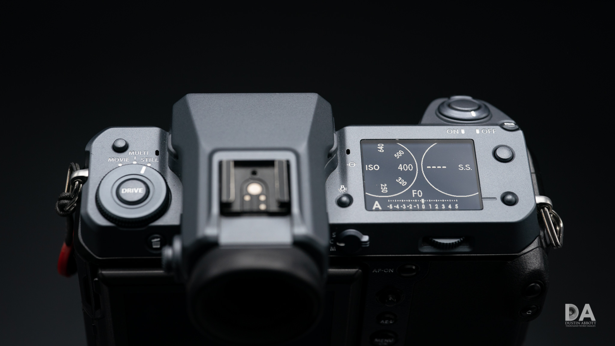Fuji cameras are typically known by their plethora of physical controls (particularly dials), so it is more than a little ironic that their flagship camera almost entirely abandons those physical dials for virtual ones accessible through the top LCD. ISO, shutter speed, mode, and exposure compensation are typically handled via dials on the X-T3 or X-T4; none of these are handled by physical dials here. The only dial (on the left top side of the camera) is a basic mode selector (Movie | Multi | Stills) with a drive mode button in the middle, but that button opens an on-screen selection process. The small Single | Continuous | Manual switch is located to the right of the viewfinder rather than on the front of the camera like on the X-T series, which isn’t a bad change ergonomically.