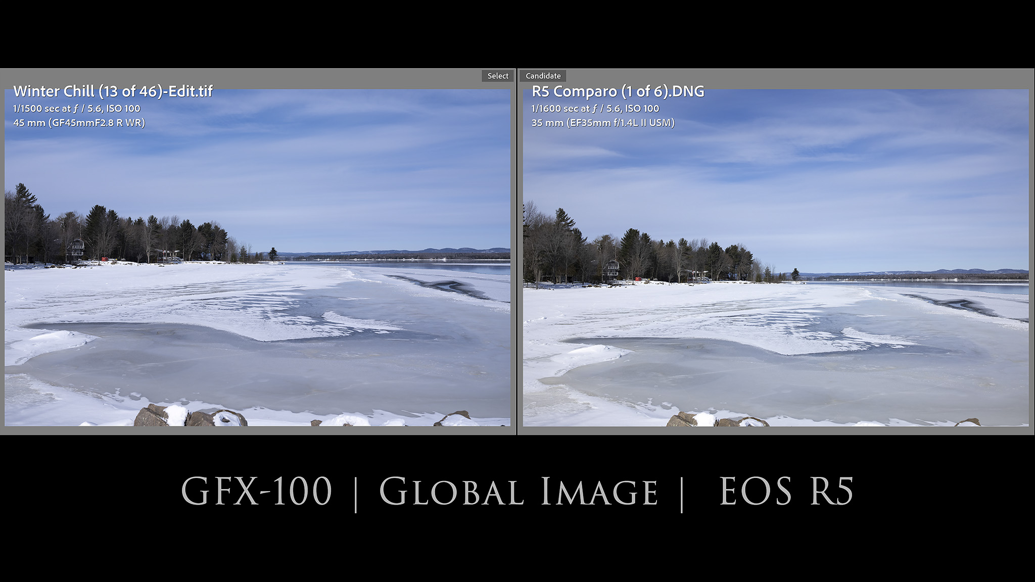 I ran a lot of different comparisons with the Canon EOS R5, which has one of the best sensors in any current full frame camera. I had the Canon EF 35mm F1.4L II on the Canon for this comparison and the Fujinon GF 45mm F2.8 WR on the GFX-100. I would argue that the Canon lens is definitely the superior one of the two, but there’s no question which sensor is better. I cropped the ratio and downsampled the Fuji image to the same dimensions as the Canon for a more direct comparison. Here’s a look at the full images: