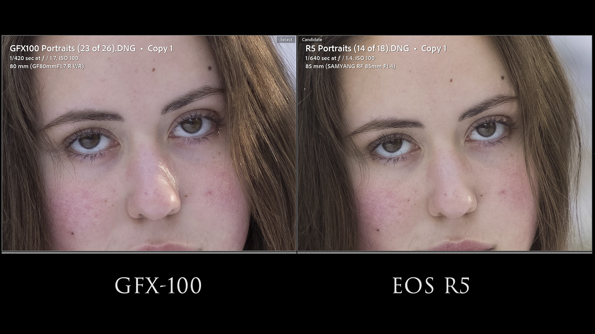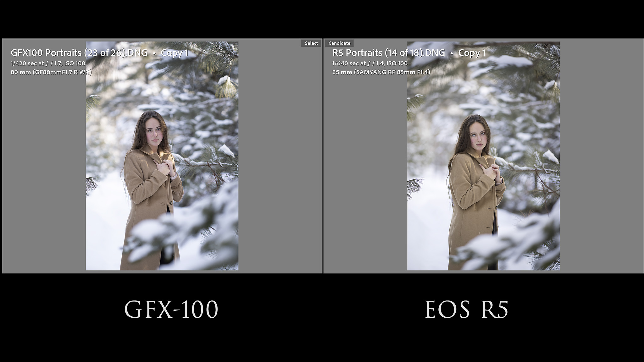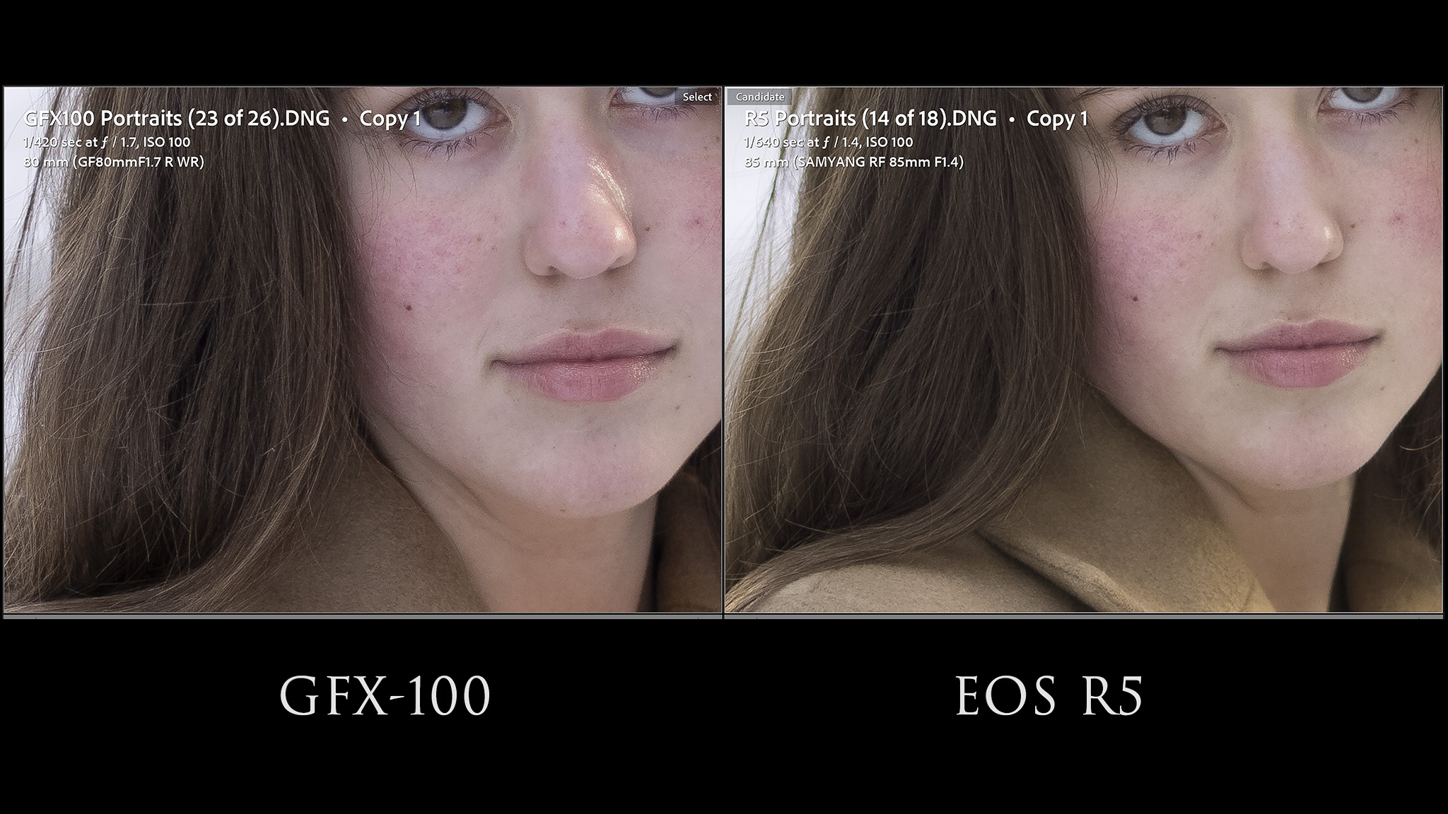 Before jumping into ISO and Dynamic Range, let’s take a look at the medium format advantages for portraits. The newest full frame sensors have, I believe, closed the gap, though I do see some minor advantages here. I used the new GF 80mm F1.7 WR on the Fuji and the Samyang RF 85mm F1.4 on the Canon as it was the closest match I had (a 65mm lens would be the better comparison), so the compression on the shot slightly favors the Canon combination. I’ve cropped and scaled the two images to be as even a match as possible. Here’s a look at the global images: