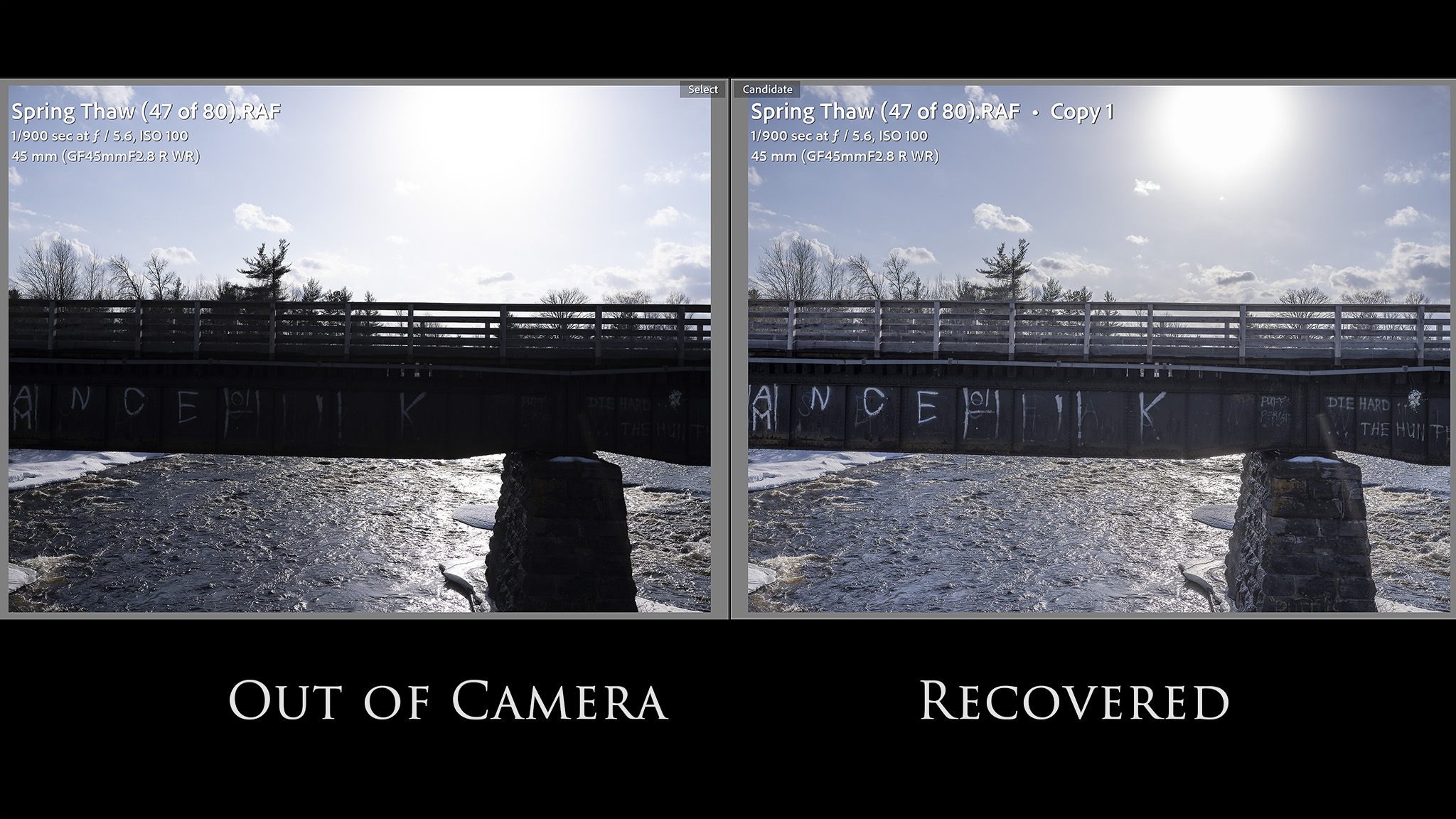 According to photonstophotos.com, the GFX-100 has about one half stop better dynamic range than the Canon EOS R5, which is itself a hair better than the Sony a7RIV and A1. I personally found comparing the EOS R5 and GFX-100 a little difficult for the simple reason that the sensor on the EOS R5 has higher sensitivity and meters about a half stop brighter when identical settings are used, making it hard to find a true equivalency. Comparisons aside, though, I did find processing images from the GFX-100 to be pretty much a joy with a lot of latitude for manipulating shadows and highlights. Shadow recovery eclipses highlight recovery as per usual, so if you want bias your results in any way to increase dynamic range, underexpose a bit.