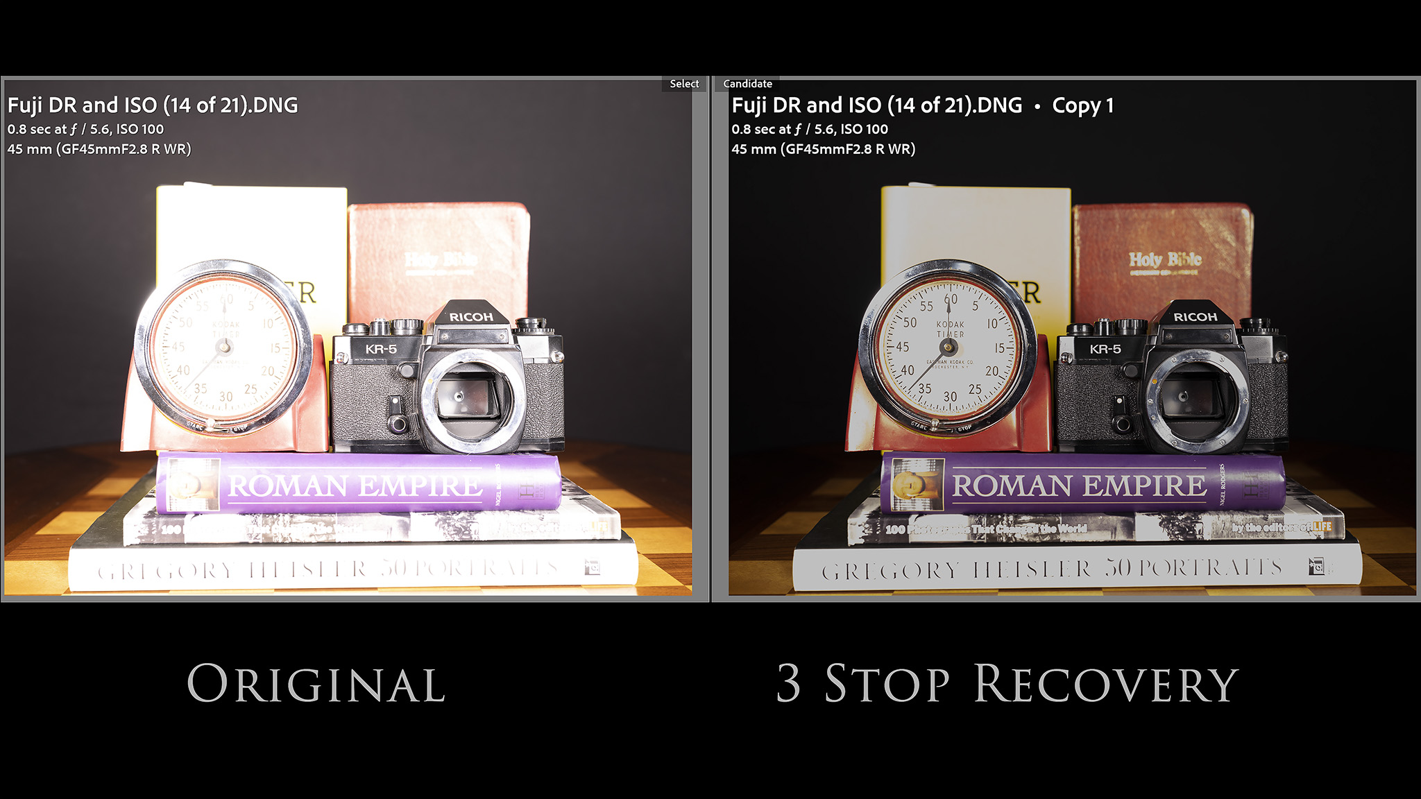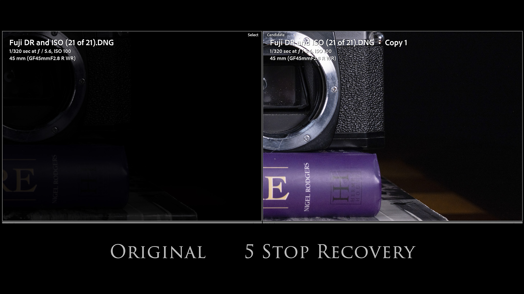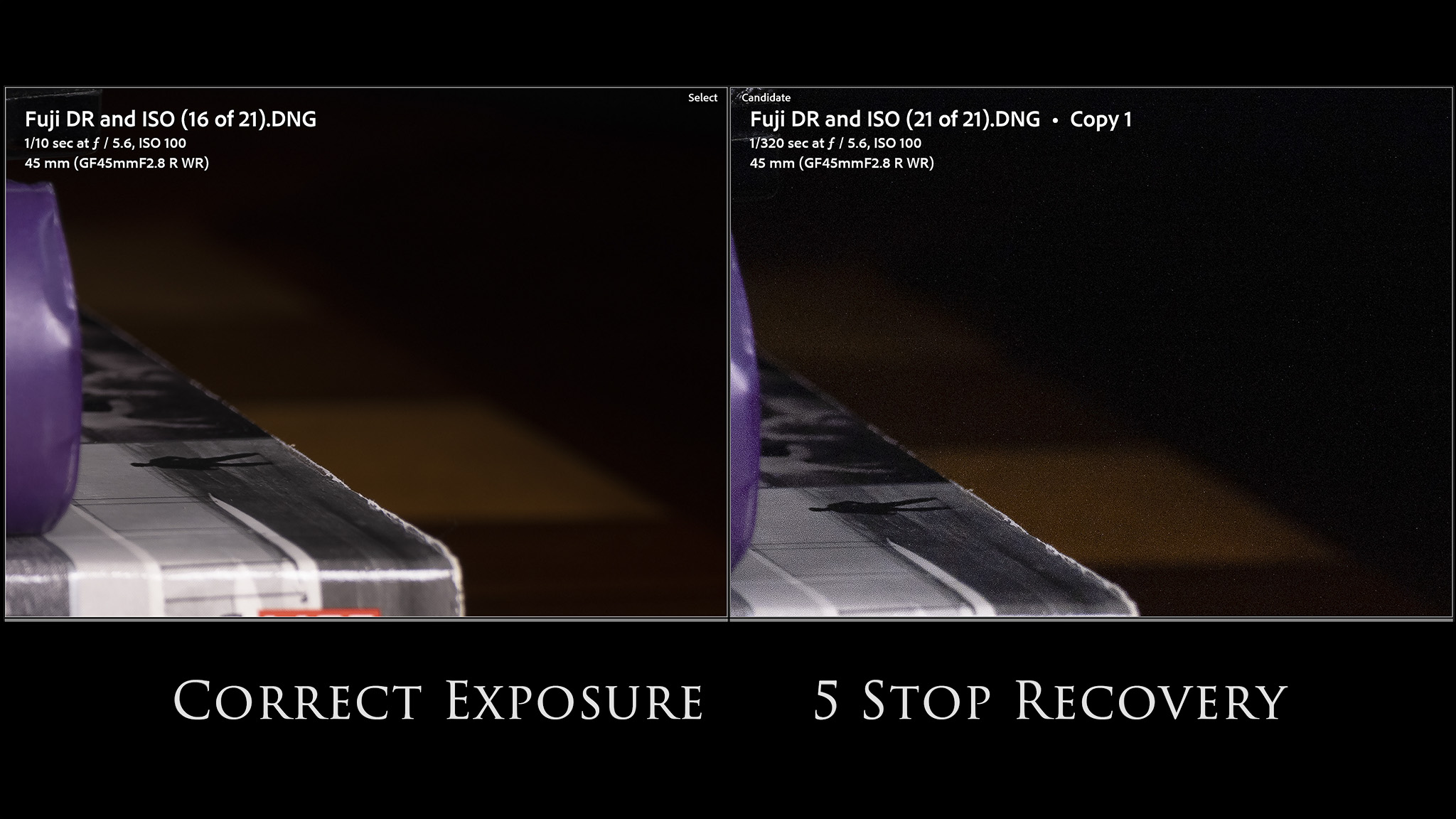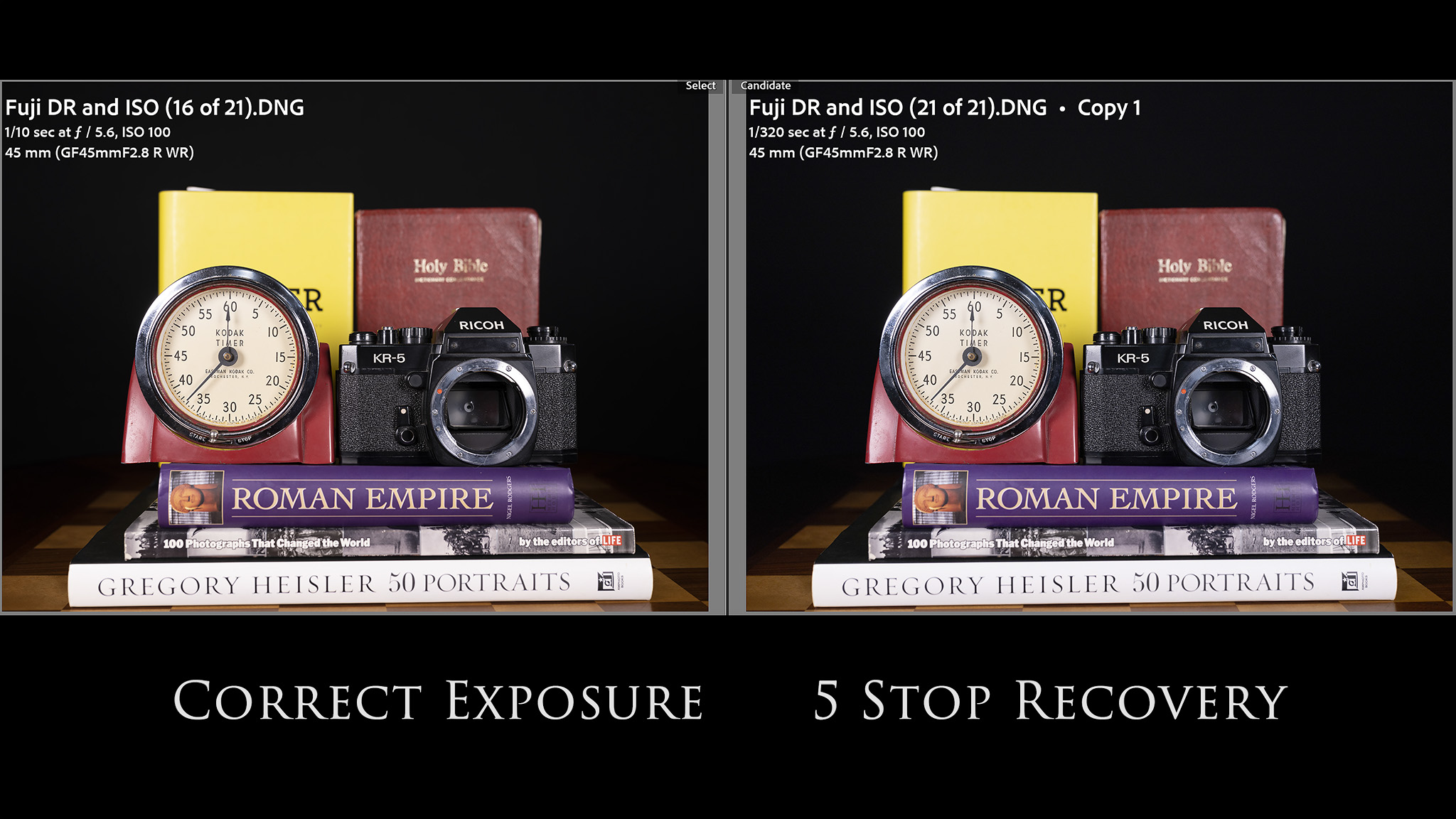 In my formal series, my base ISO was 1/10th of a second. I underexposed five stops from that baseline (1/320th second) and then added five stops of exposure back in post. Here’s what the two images look like side by side: