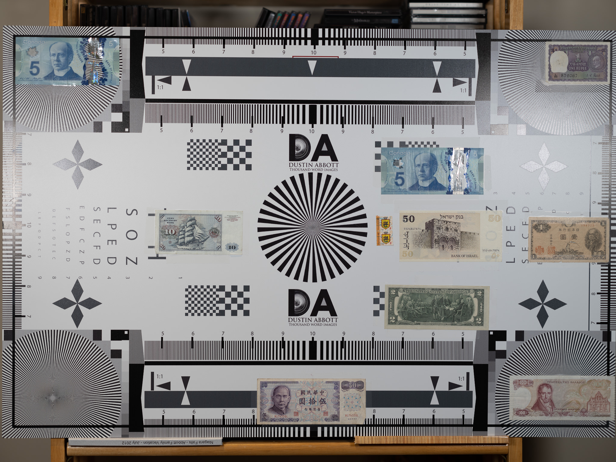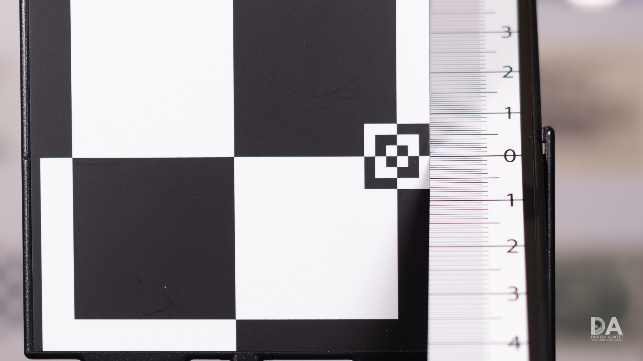 So let’s see how that plays out for resolution and contrast. One minor note before we jump into the chart tests. My chart is designed for the typical 3:2 ratio of full frame and APS-C cameras, but the GFX-100 has a squarer 4:3 ratio, meaning that the corners of the chart don’t quite line up with the corners of the sensor. No big deal other than I’m sampling a little further from the extreme corner than usual. Here’s a look at my test chart: