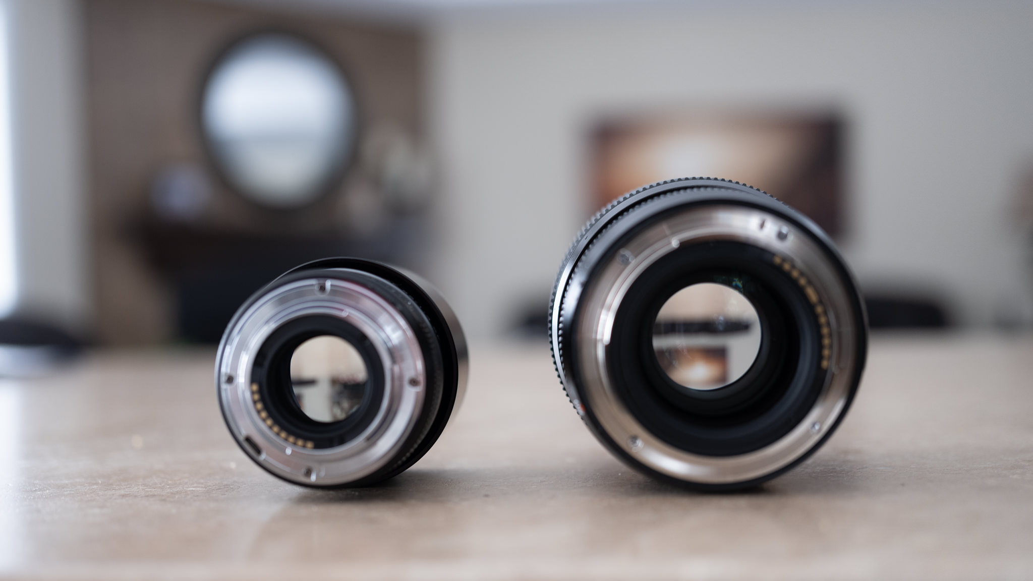 If you are unfamiliar with medium format and know Fuji more for X-mount, prepare to be shocked by how huge the mount size actually is. The Fuji X-mount (APS-C) is 44mm is diameter; the GF mount is a whopping 76.5mm in diameter. The Canon full frame RF mount is 54mm in diameter by comparison, closer to the APS-C size than the massive medium format dimensions. The front opening of lenses changes according to the focal length and aperture combination, but the rear diameter at the mount is consistent. You can see just how much bigger lenses are going to be from the mount onward by comparing the X-mount lens on the left to the GFX lens on the right.