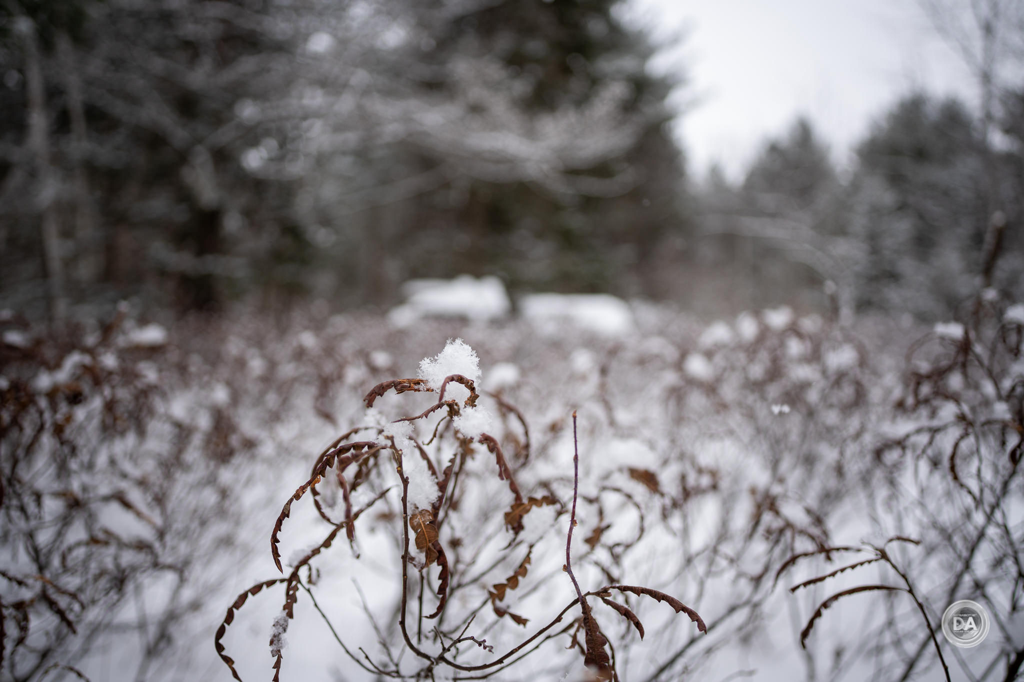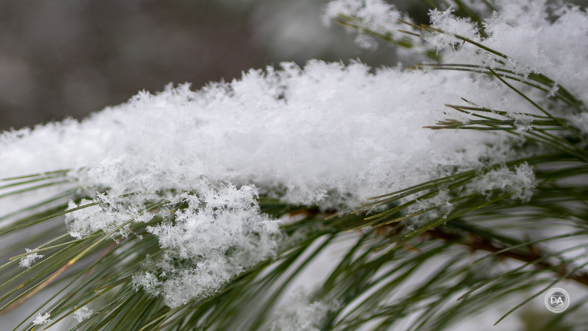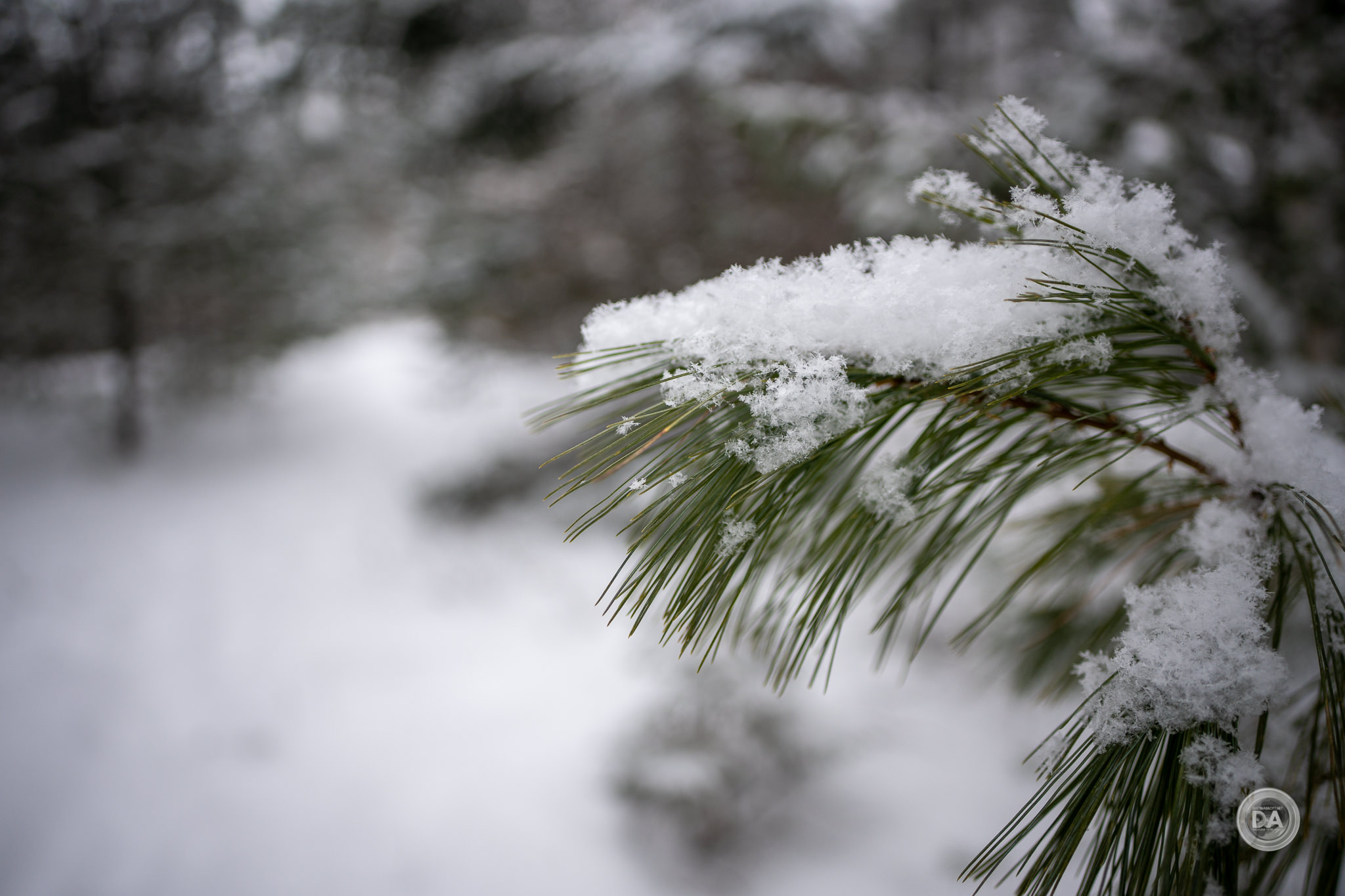 You can see excellent focus up close on the snowflakes on the pine needles.