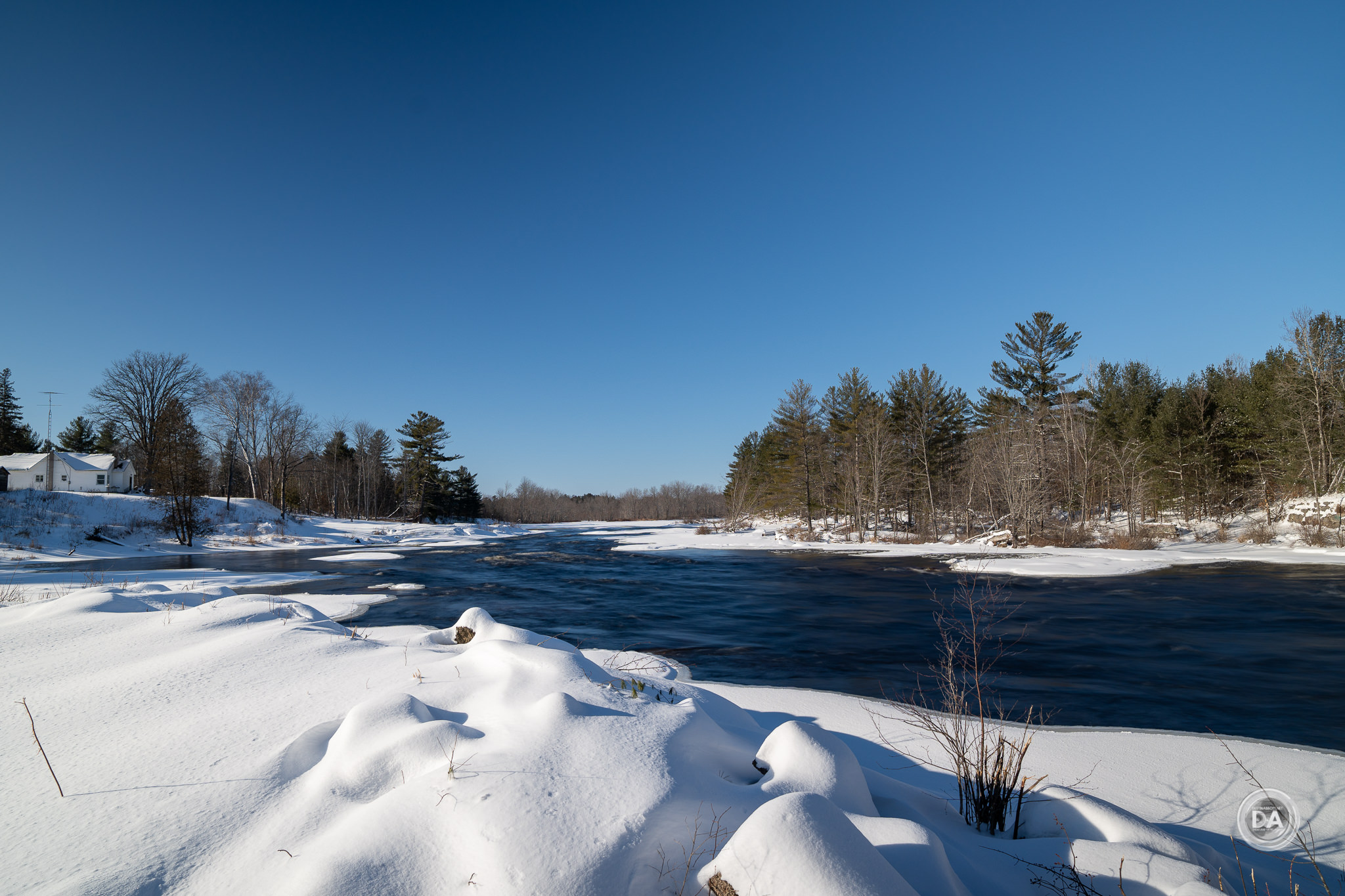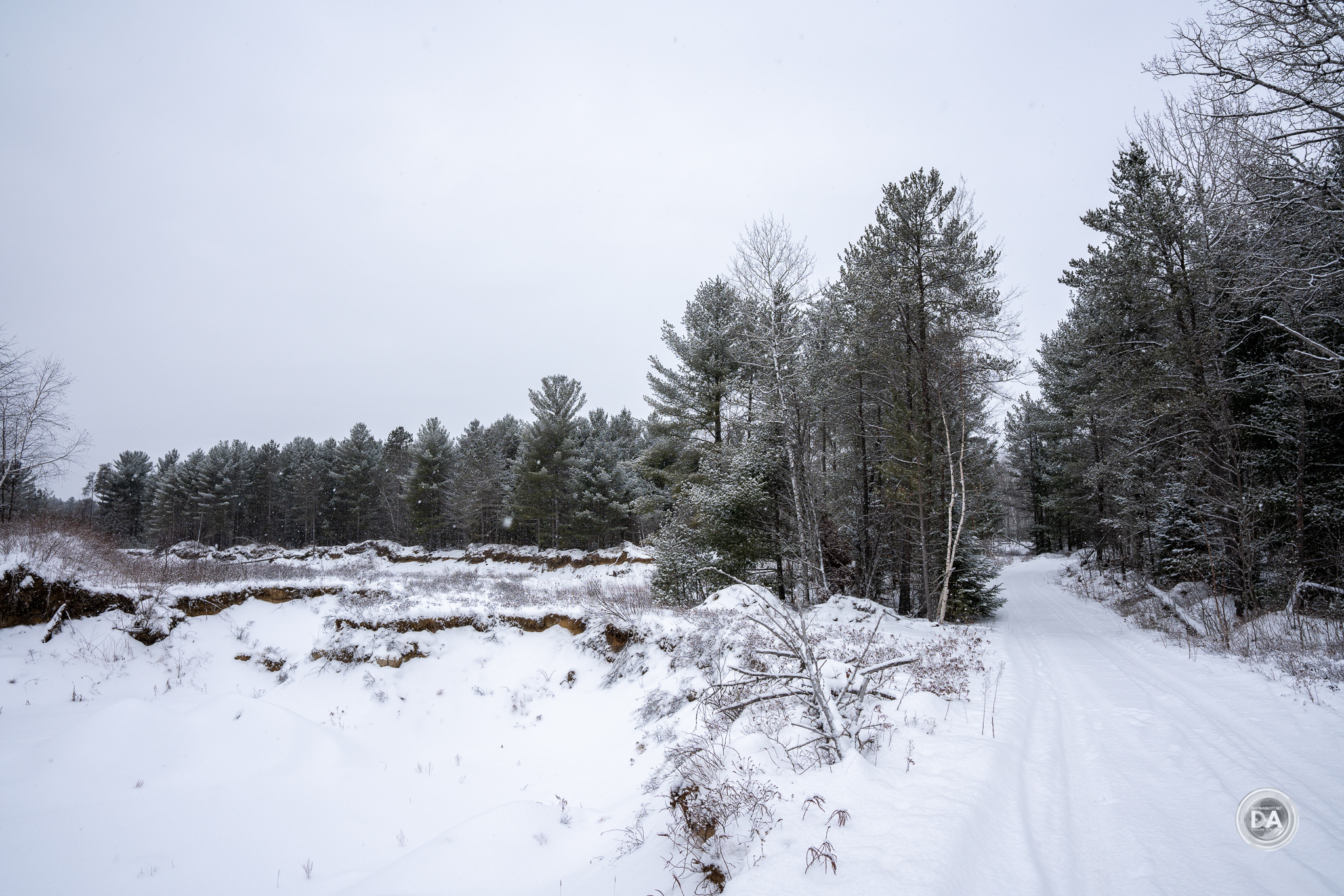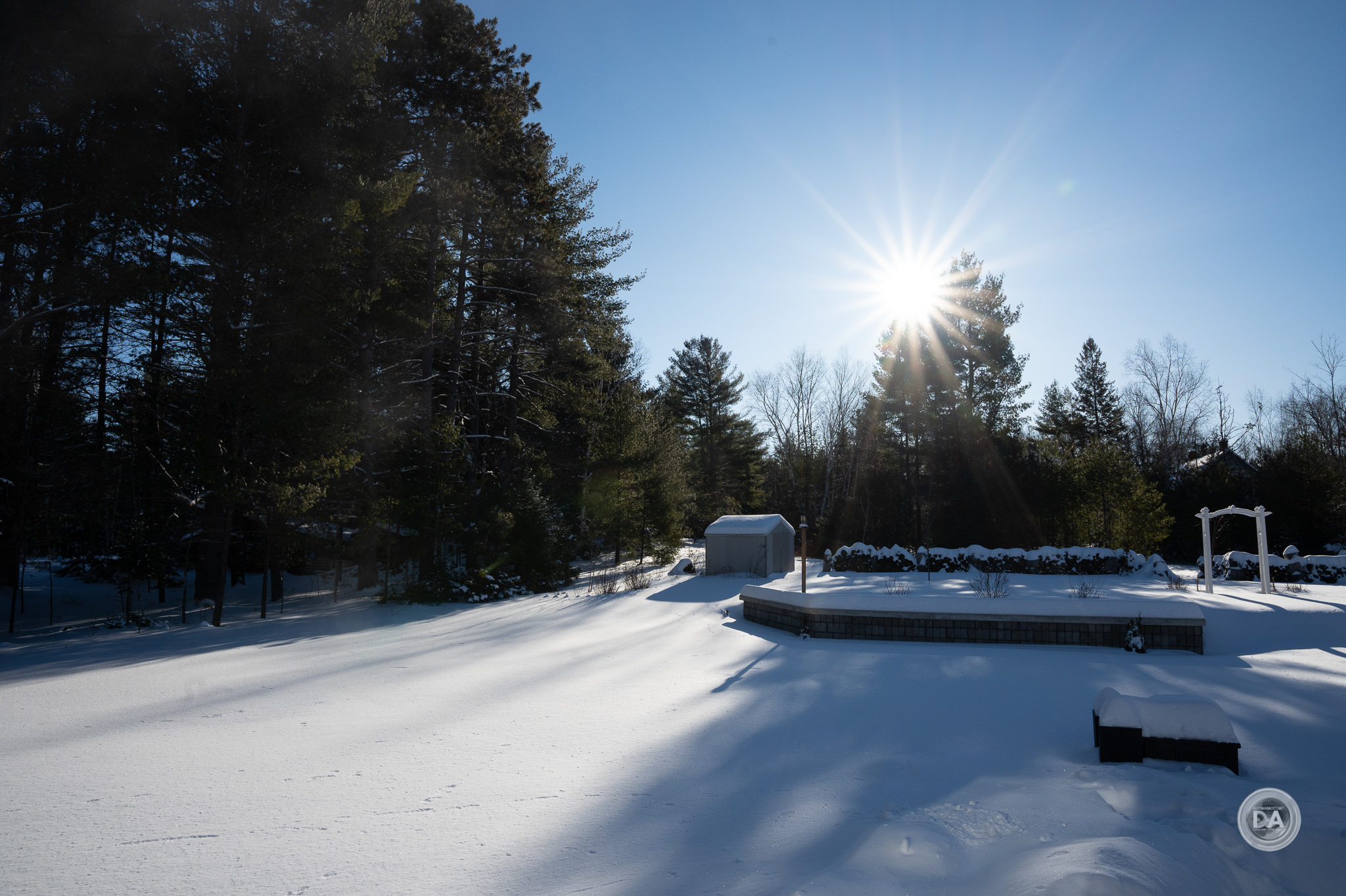 Vignette is also extremely heavy at F2 (again, even in the corrected JPEG). I had to dial in a +88 and slide the midpoint over to zero. I particularly noted that the vignette penetrated so deeply and heavily into the image frame that it seemed to impact exposure. I also found that while vignette improves as you stop down the lens, it never quite disappears. I did my review during winter, obviously, and snowy scenes really punish vignette. You can still seem some darkness in the corners of this image at F5.6: