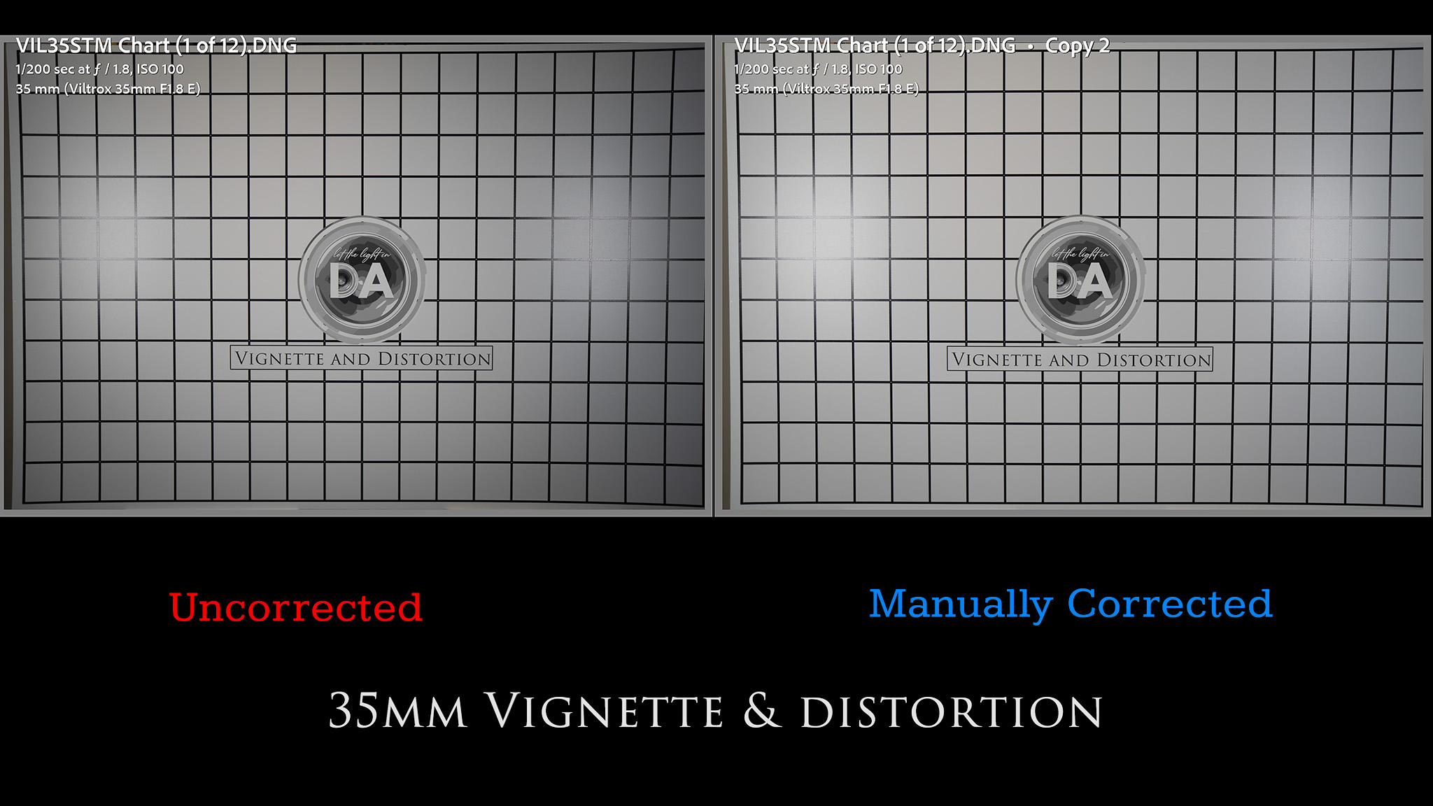 We’ll work through the chart results by first looking at distortion and vignette. I’ll note that once again I was pleasantly surprised to find that there was already a standard correction profile in Lightroom for the lens. This is a lens that is only just now coming to market, so it’s impressive that Viltrox is now getting this level of software support. The profile does a pretty good job of correcting for distortion and vignette: