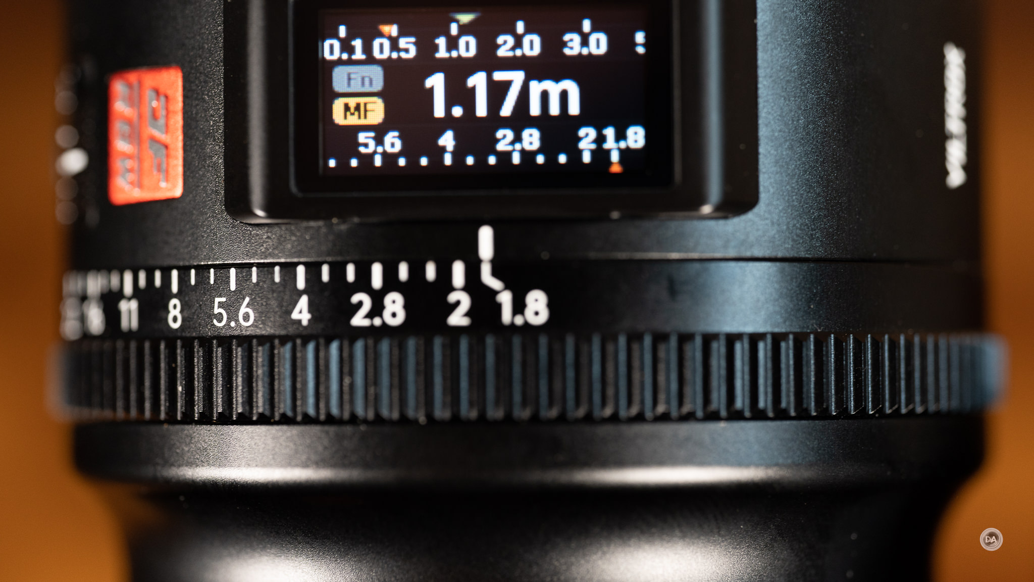 Beneath that is a brand new feature for Viltrox – dual FN (function) buttons. The top one functions like the typical “Focus Hold” button on Sony cameras, which will perform whatever function you have that button programmed to in camera (my current default is to switch between the different Eye AF options). The second button is going to be used more commonly for video functions, however, as when in manual focus mode it allows you to preset two focus positions and automatically switch between the two at the press of the button. This works in conjunction with the LCD screen on the top of the lens (more on that in a moment). You can preset the focus position by long pressing the FN 2 button, and then access the focus changes by short pressing it. I love having these two buttons, though I will add one minor criticism – the feel of the buttons isn’t great. They are a little vague and rubbery, and I find myself pushing them harder than what I would prefer. It’s a minor critique, however, as they work fine and add a lot of functionality to the lens.