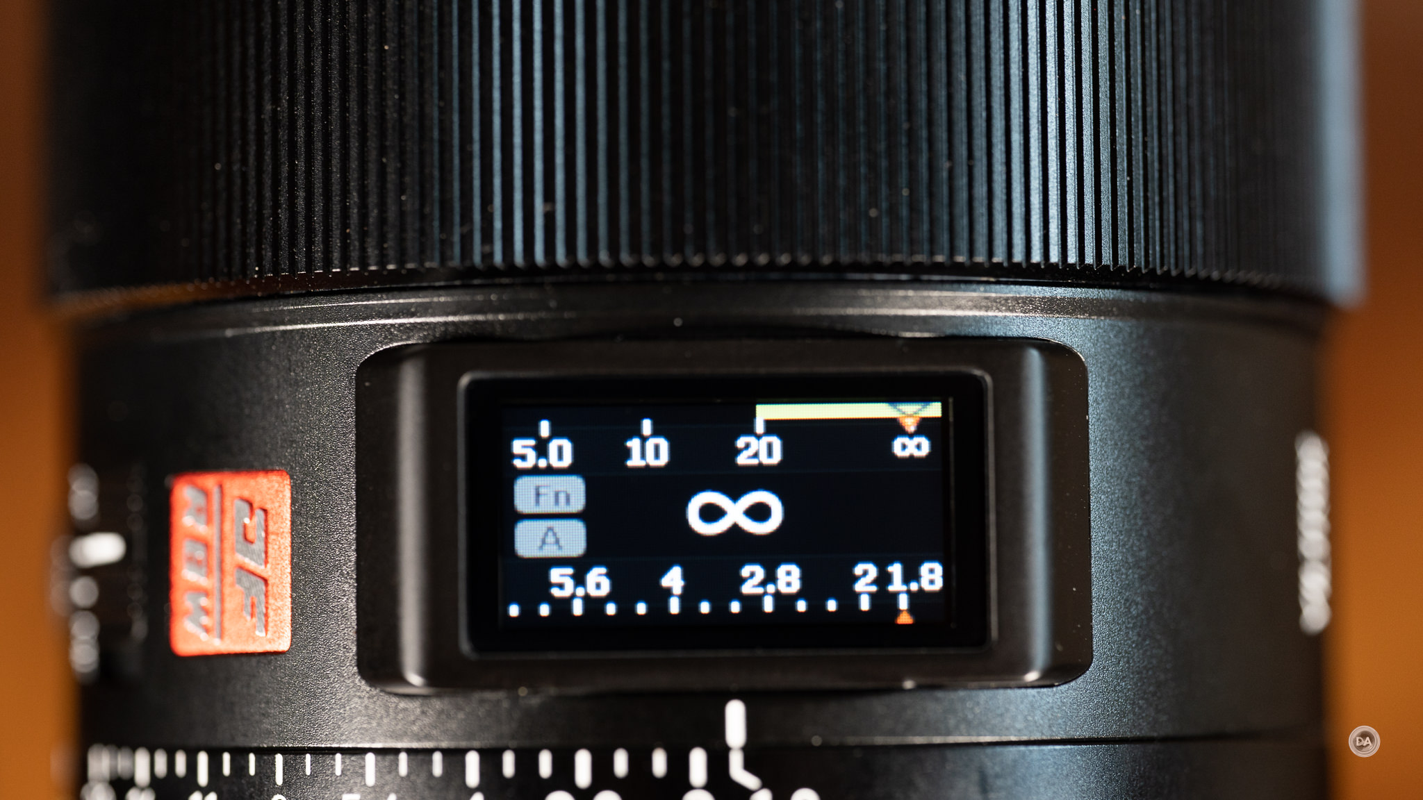 Now to that LCD screen. The LCD functions in many ways like those found on the Zeiss Batis lenses, though with some improvements. The screen itself is nice and bright, allowing for good visibility even in bright conditions. It solves the problem of a distance scale (something missing on most mirrorless lenses), as it gives you a large font telling you the precise focus distance along with a distance scale above that. The bottom part of the screen gives you a readout of the current aperture, which is more useful if you are electing to not use the manual aperture ring and are controlling aperture from within the camera. It also gives you some information related to the function buttons however, with the Fn icon lighting up when the first Function Button is depressed, and then the A function lights up when you are presetting focus distances. There is a small green arrow that shows the current focus distance, and then you can preset the two desired focus distances which will be marked with a small orange arrow over the top of the both of them. There’s actually a lot of useful information on the LCD screen once you get familiar with how it is all being displayed.