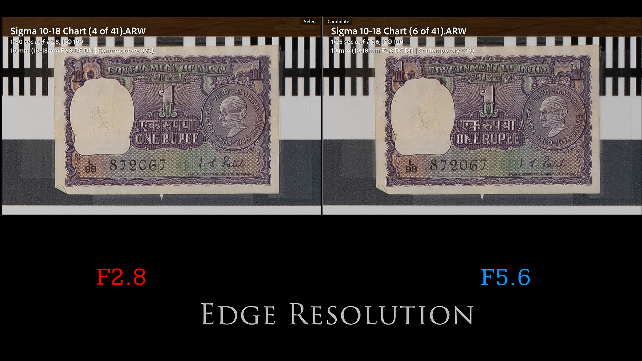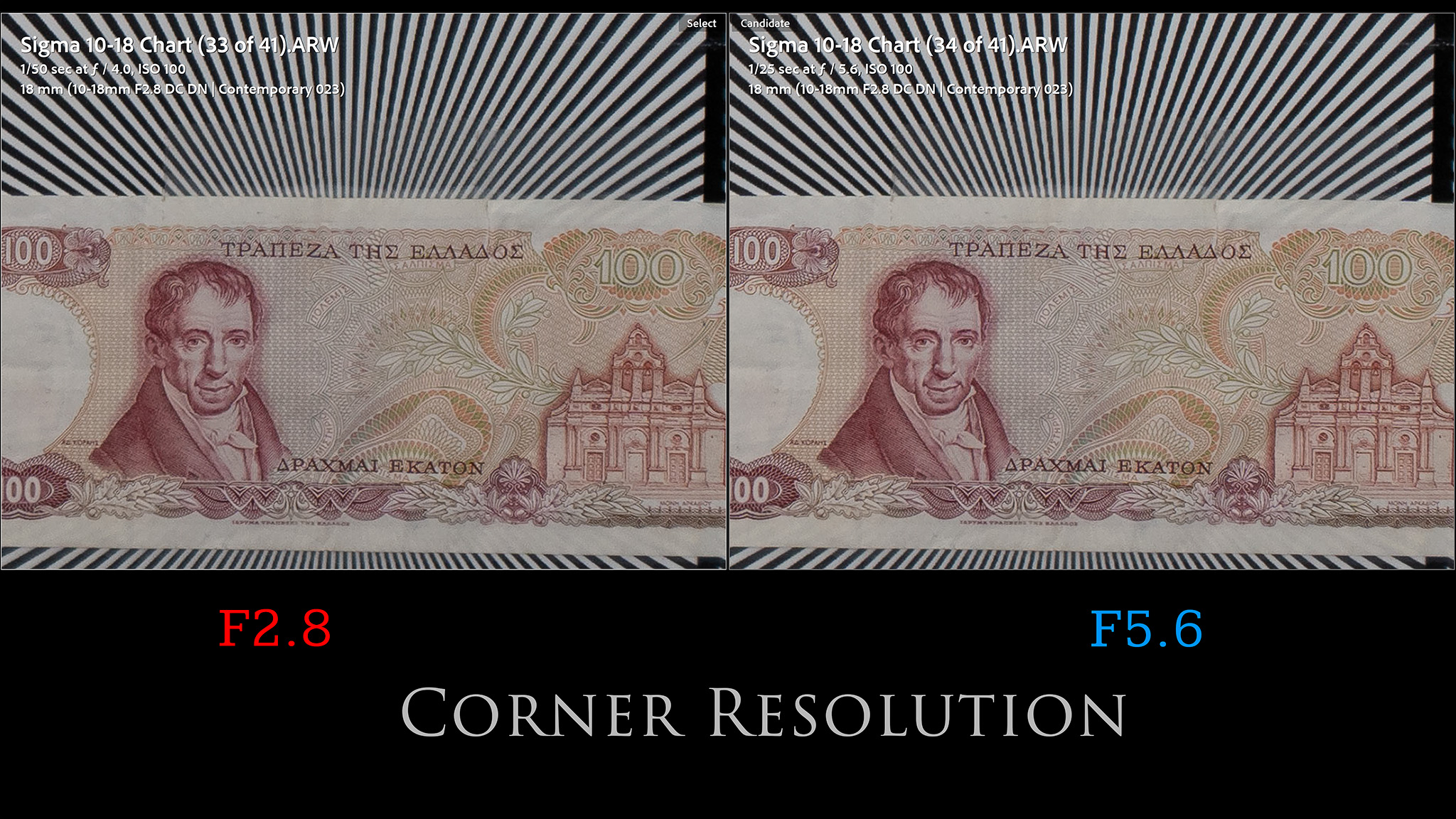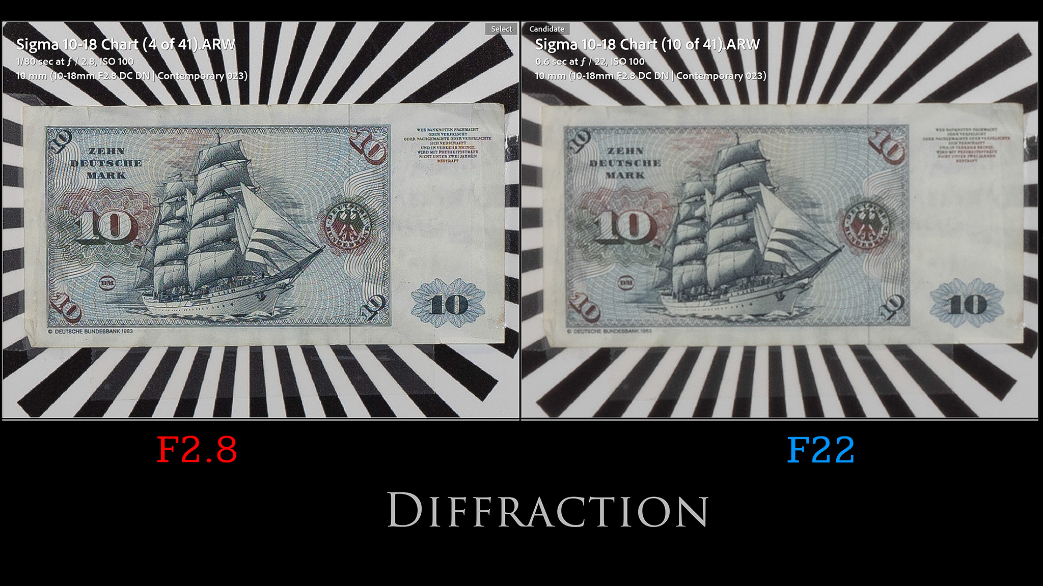 I didn’t see any further improvement at F8, with F5.6 and F8 looking near identical. After F8 you will start to see some regression due to diffraction. By F22 (minimum aperture), diffraction has really softened the image.