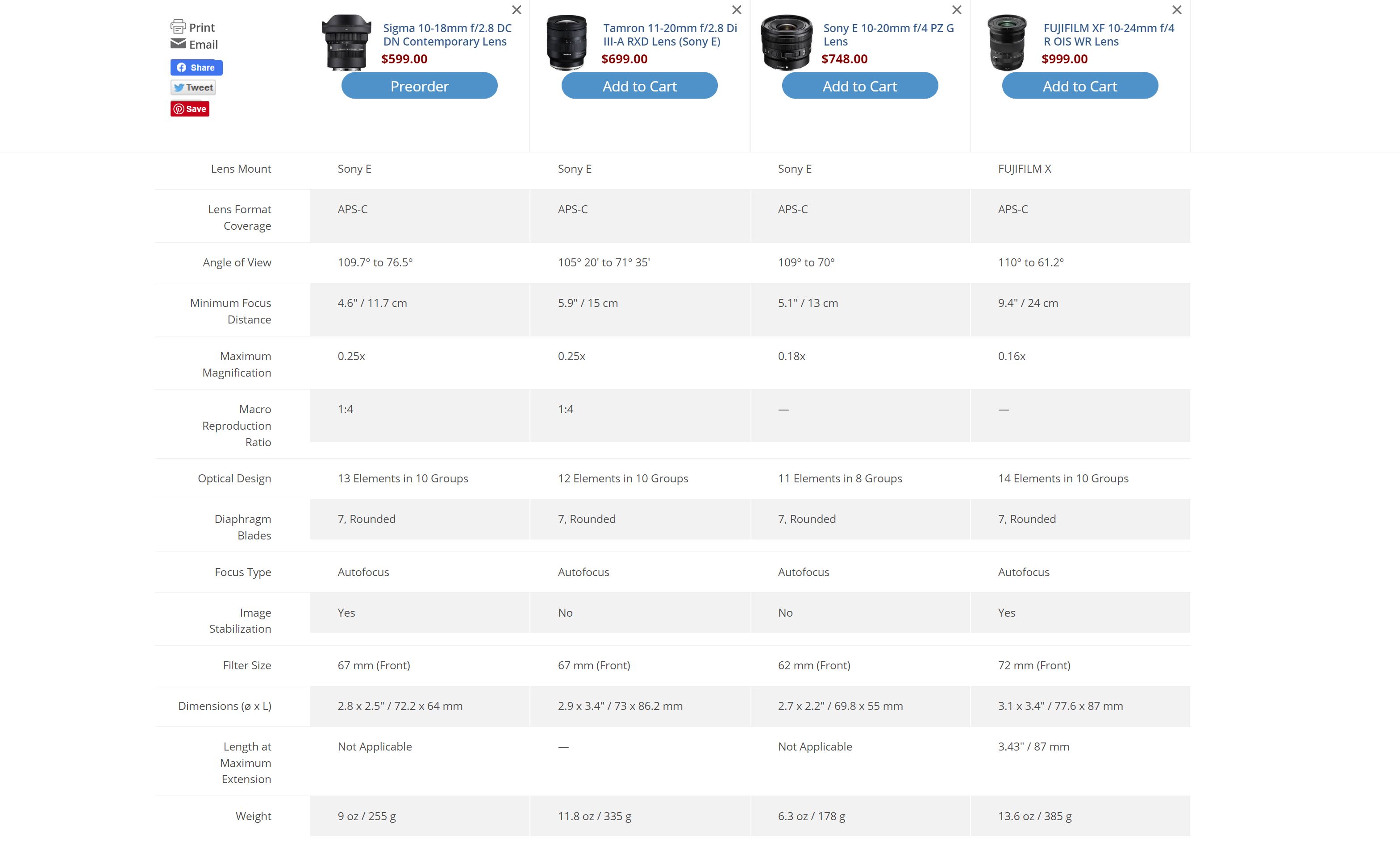 You’ll note that the Sigma is the cheapest of their four lenses at $599, and also manages to be the second smallest and lightest despite going wide (10mm) and having a larger maximum aperture. It also has the smallest zoom ratio, though not by much. I suspect that many will find the weaknesses an acceptable tradeoff for the significant strengths.