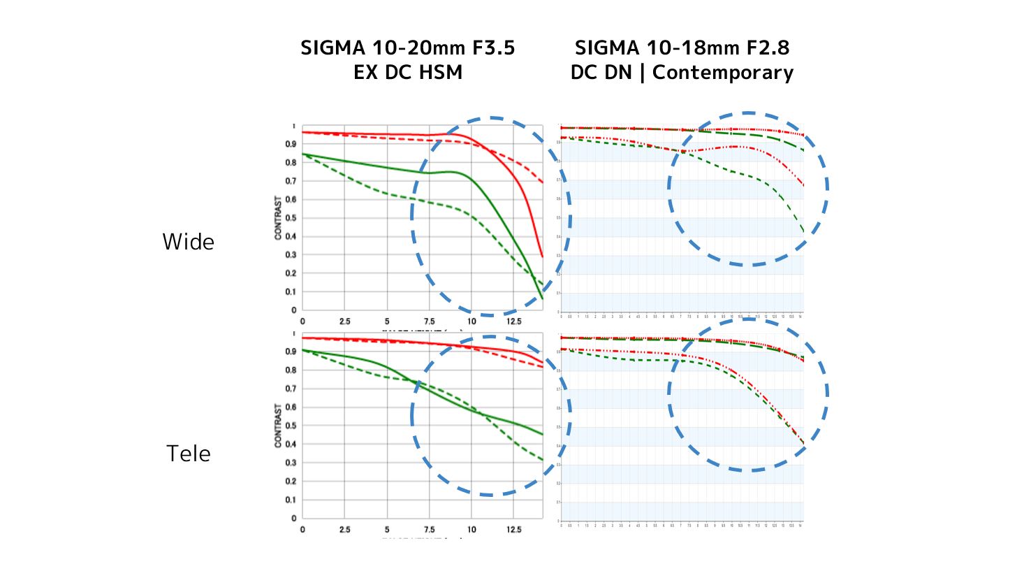 The Sigma 10-18mm DN sports a relatively complex optical formula for such a small lens. There are 13 elements in 10 groups, and that includes number of exotic elements like 4 aspherical elements (including a large GM aspherical concave lens as the front element), 3 FLD elements, and one SLD element. The MTF chart and comparison shows a significant improvement over the older Sigma 10-20mm F3.5 that the was equivalent lens for DSLRs. The MTF chart shows a very strong center and midframe at both ends of the zoom range with minimal falloff in the corners at 10mm. There’s a stronger falloff at 18mm in the corners.