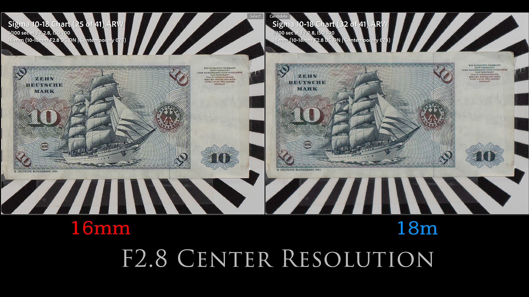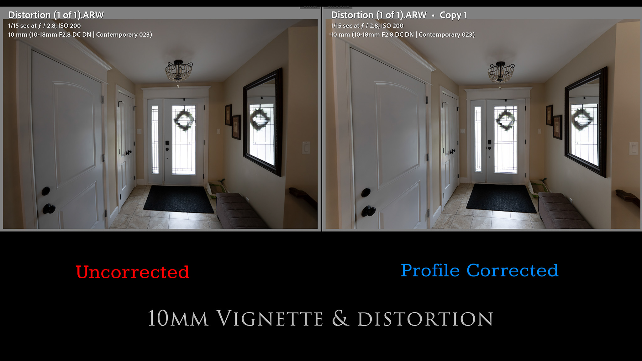 We’ll work through the chart results by first looking at distortion and vignette. Here’s a look at the before and after of manual corrections to both at 10mm, then at 14mm, and finally at 18mm.