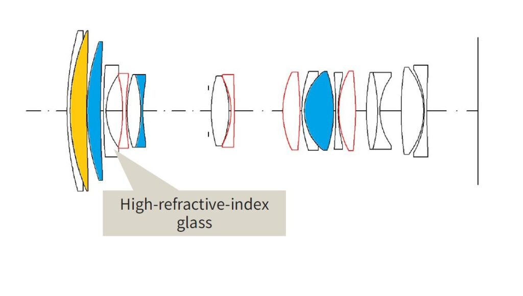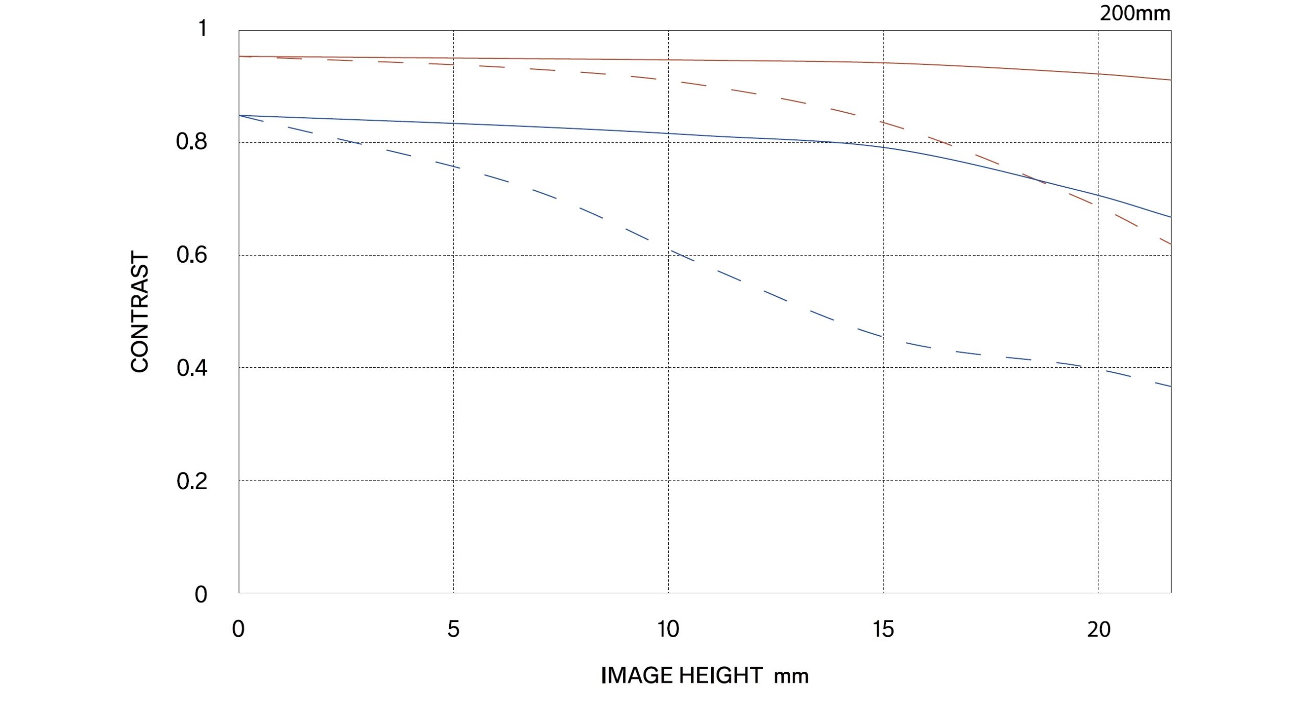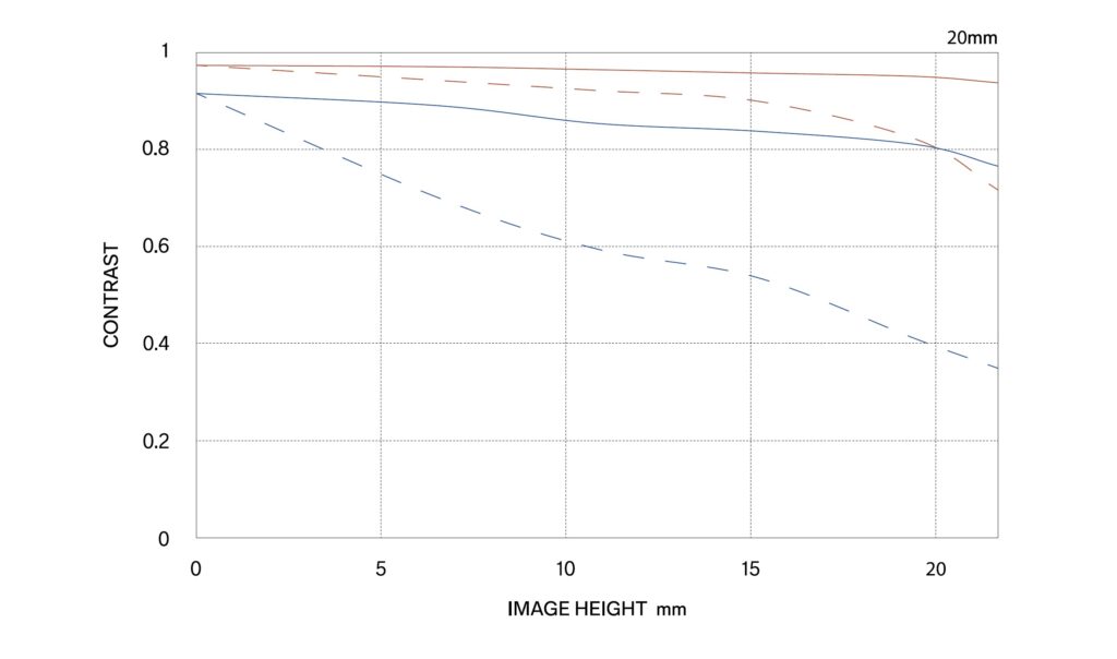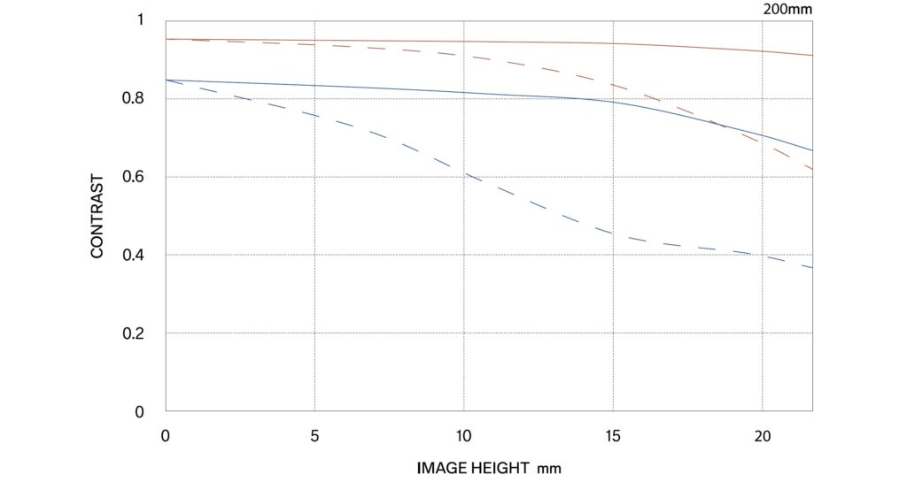 Lenses like this are by necessity fairly complex. The optical design is 18 elements in 14 groups. There are 4 ASPH, 1 FLD, and 3 SLD elements as a part of the design. The MTF charts show very good meridional performance (solid line) but more shaky sagittal performance (dotted line), which results in some astigmatism.