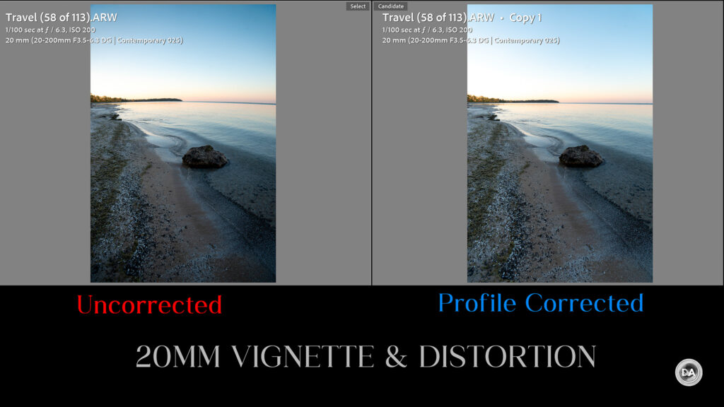 This is bad enough to have some real world ramifications. You can see from the image on the left in the comparison below that even in a composition far from the edge of the frame the curvature of the horizon is obvious…and remains less than perfectly straight after the profile correction on the right.
