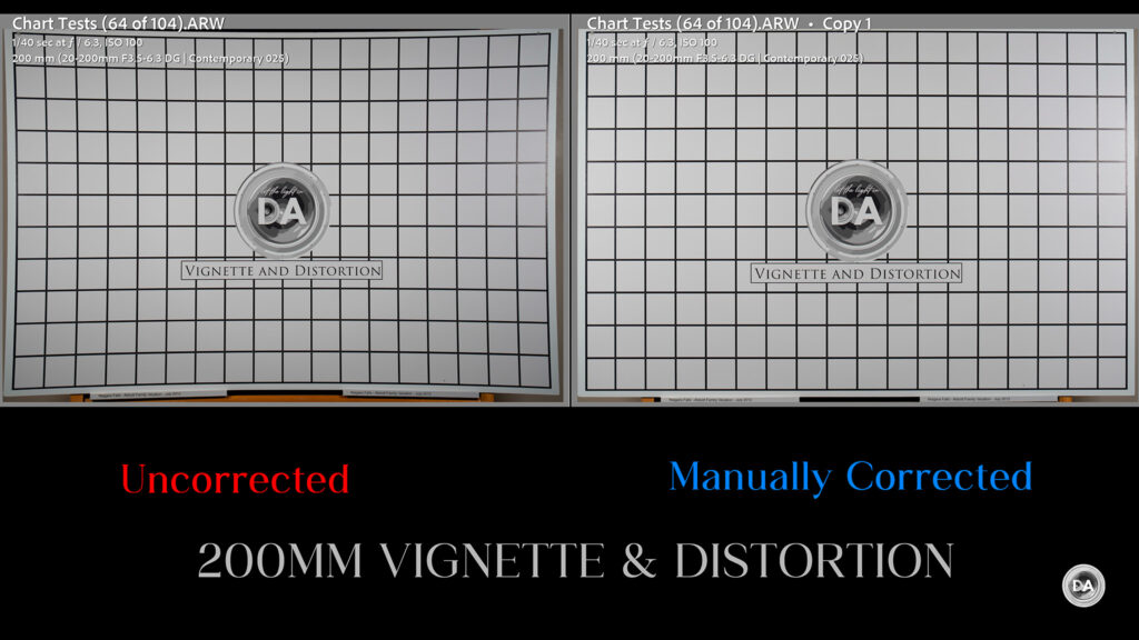 I saw a near identical vignette and distortion pattern at 135mm and 200mm. Here at 200mm I used a -11 to correct the distortion and a +41 to correct the vignette.