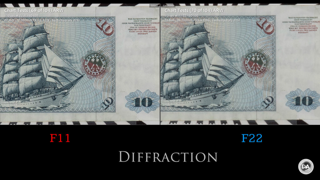 Variable aperture zooms like this can have pretty small minimum apertures. At 20mm the minimum aperture is F22, but by the telephoto end that becomes F40. Diffraction is going to be a factor at any of those minimum apertures, however, resulting in less contrast and detail.