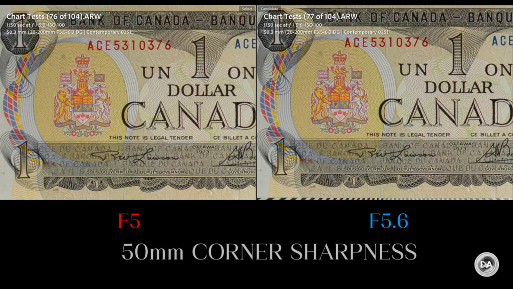 Moving on to 50mm finds the maximum aperture just F5, but the performance is more consistent across the frame. A little less sharp in the center, but more consistent in the midframe and corners.