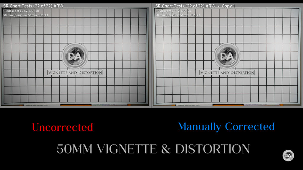 There are some mixed reviews here. The amount of distortion is small but not linear. The inner lines are near perfect, but there is some pincushion effect right near the edge of the frame. Any attempt to manually correct the pincushion distortion introduces some barrel distortion, so I’ve left it uncorrected. Hopefully a correction profile (when it becomes available) will correct that. For perspective, however, I will point out that the Sigma 50mm F1.2 ART actually has a hair more distortion and only a hair less vignette.