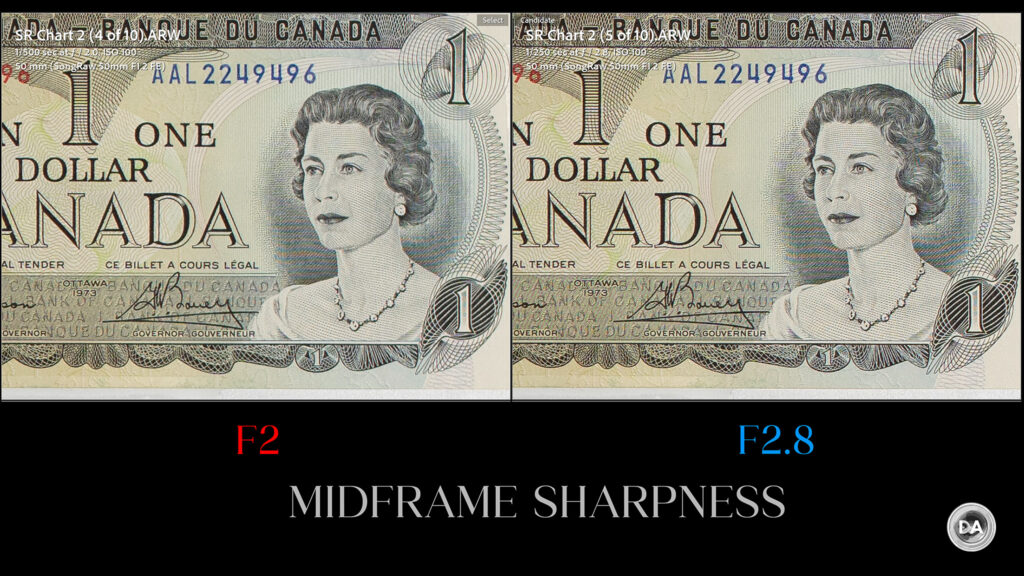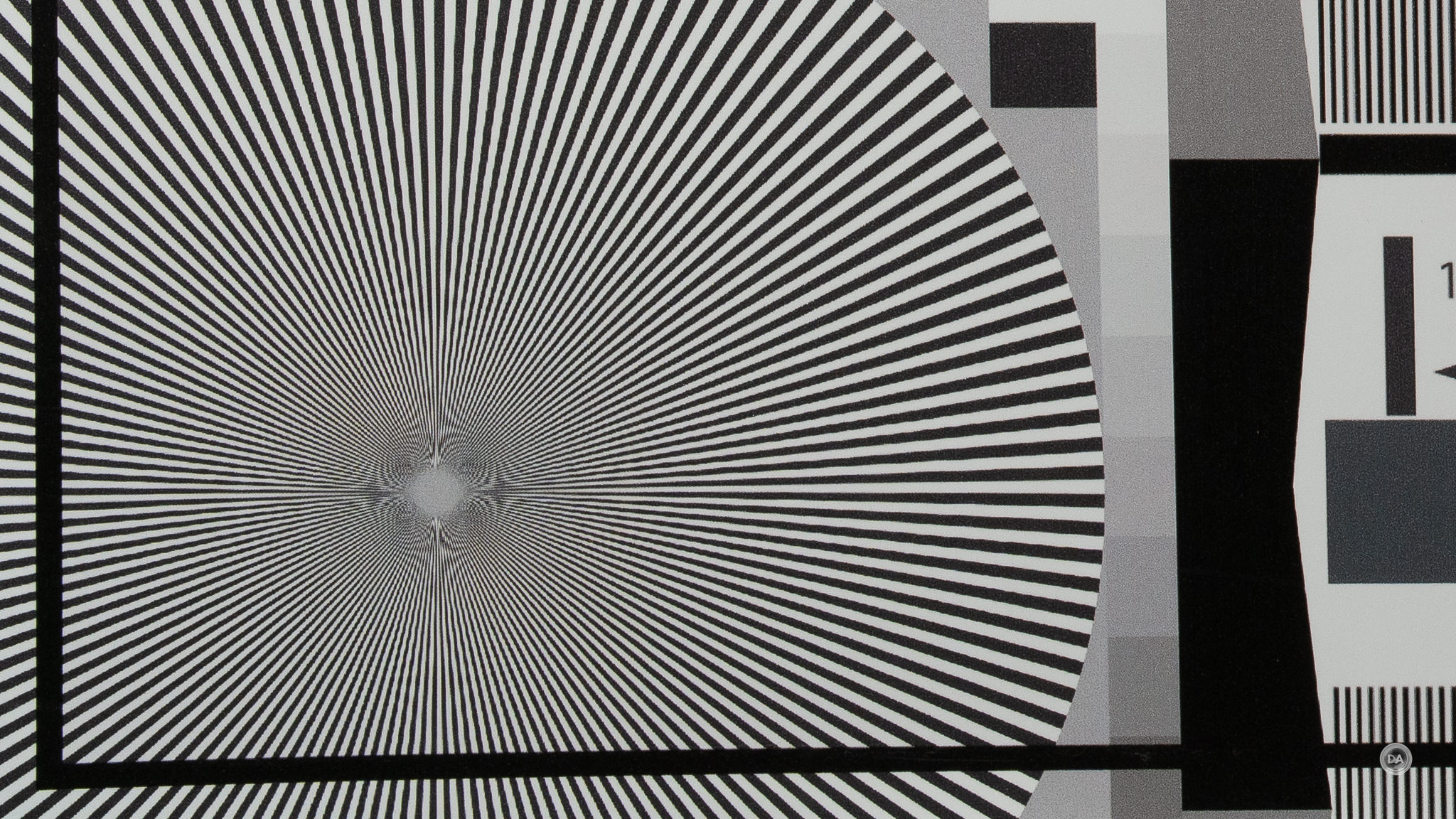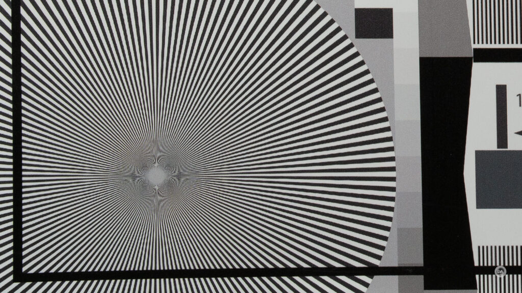 The MTF suggests that this is going to be ebbs and flows in terms of detail and contrast across the frame. Is that what we find? Here’s the test chart at F1.2: