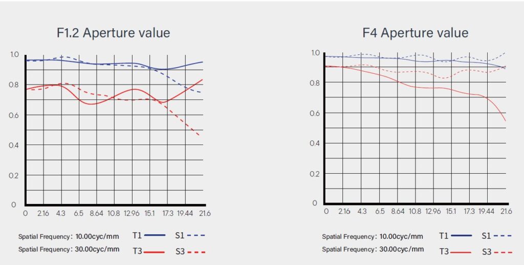In this section we start to see the real strength of the new SongRaw lens, as while it isn’t the sharpest of the three 50mm F1.2 lenses, it manages to stay close while also providing a really lovely bokeh rendering. This is an optical design of 15 elements in 10 groups, with 7 High Refractive (HR) elements, 4 Extra-low Dispersion (ED) elements, and 2 Aspherical (ASPH) elements. That leaves only two ordinary elements in the whole design; this is a sophisticated optical design. The MTF chart is a bit interesting, as rather than a linear fade from the center to the corner we instead see a bit of a roller coaster ride up and down. The F4 chart on the right shows a more traditional optic signature.