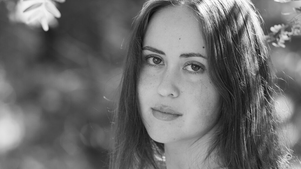 A tight crop from a portrait shot shows a beautiful mix of sharpness and contrast on the subject’s face and a lovely degree of defocus beyond.
