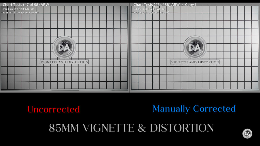 There is a mild amount of pincushion distortion (a -2 to correct) along with a heavier amount of vignette. I needed +71 to correct for the vignette.