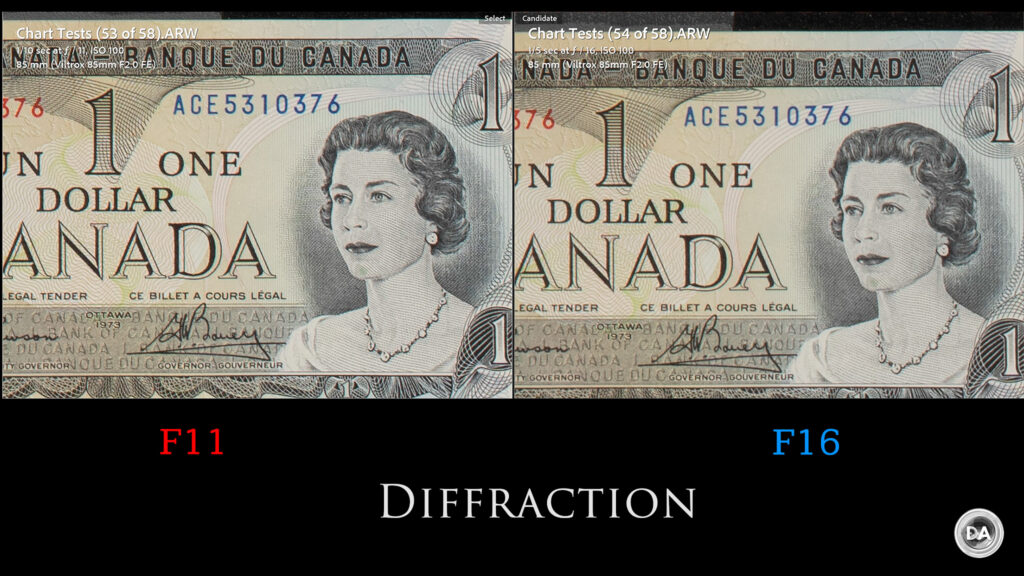 Diffraction is an unfortunate reality on higher resolution cameras, so you will see a faint softening by F11 and a more obvious softening by the minimum aperture of F16, though frankly results at 100% will still look fine.