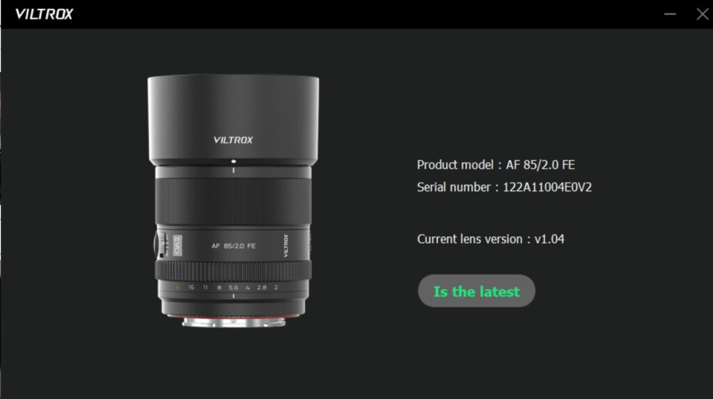 You probably also noted the USB-C port in the lens mount that allows you to do firmware updates right to the lens. I’m a fan of this approach, as it eliminates the need for a separate dock or lens station for firmware updates, and I find the process a little more intuitive than even doing firmware updates through the camera. Viltrox gives you a variety of ways to do the firmware updates. Here’s the screen I got after doing a firmware update via their PC app.