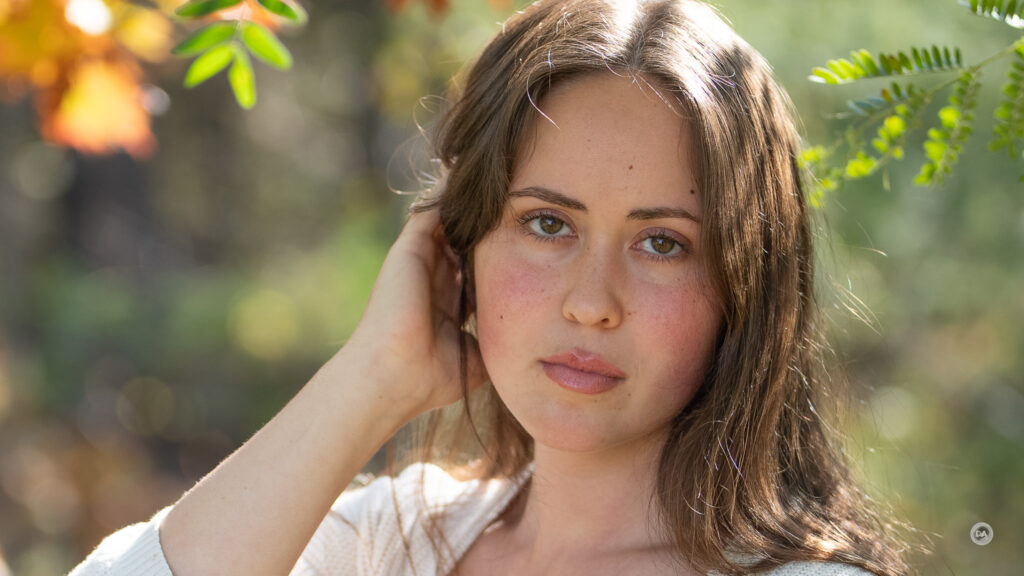 A tight crop from a portrait shot shows a beautiful mix of sharpness and contrast on the subject’s face and a lovely degree of defocus beyond.