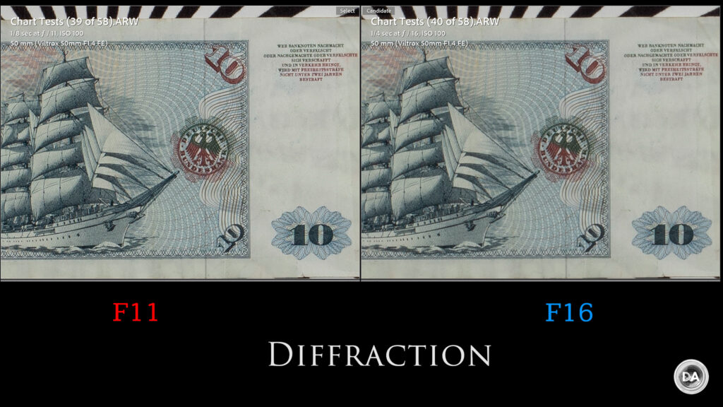 Diffraction is an unfortunate reality on higher resolution cameras, so you will see a faint softening by F11 and a more obvious softening by the minimum aperture of F16, though frankly results at 100% will still look fine.
