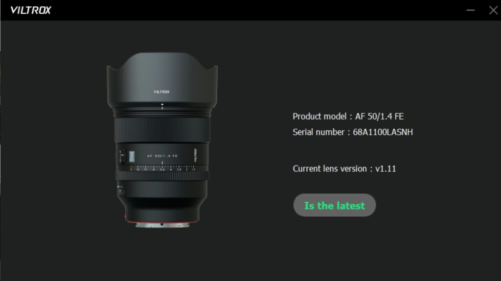Viltrox continues with a trend that other lens makers are now imitating by including a USB-C port in the lens mount that allows you to do firmware updates right to the lens. I’m a fan of this approach, as it eliminates the need for a separate dock or lens station for firmware updates, and I find the process a little more intuitive than even doing firmware updates through the camera. Viltrox gives you a variety of ways to do the firmware updates. Here’s the screen I got after doing a firmware update via their PC app.