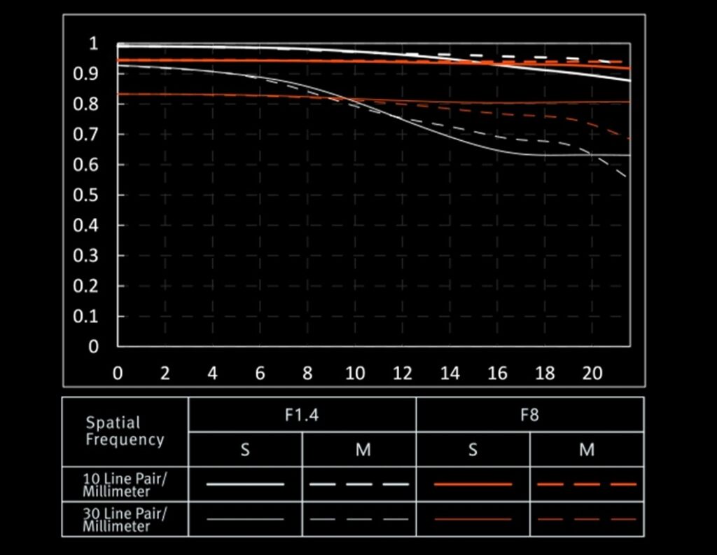 The Pro 50mm sports an optical design of 15 elements in 11 groups. This includes 3 ED (extra low dispersion) elements, a whopping 8 HR (high refractive index) elements, and one UA (ultra-aspherical) lens. That latter is a new element that I’ve only seen Viltrox start grinding in 2025. That leaves only three “normal” elements in the optical design.! The result MTF shows a strong center and midframe (all above 80%) and a mild dip in the corners at F1.4, with a little lower center sharpness at F8 but a remarkably consistent performance all across the frame. The sagittal axis at F8 is literally a straight line!