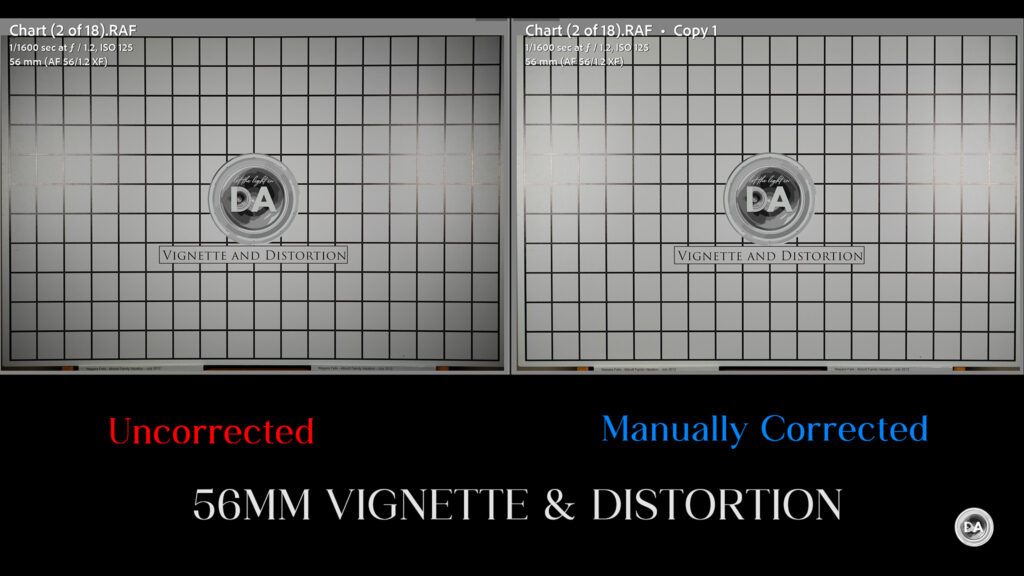 For context, I needed the same amount of distortion correction on the Fuji 56mm F1.2 WR and a little less vignette correction (+52). No meaningful difference between the lenses.